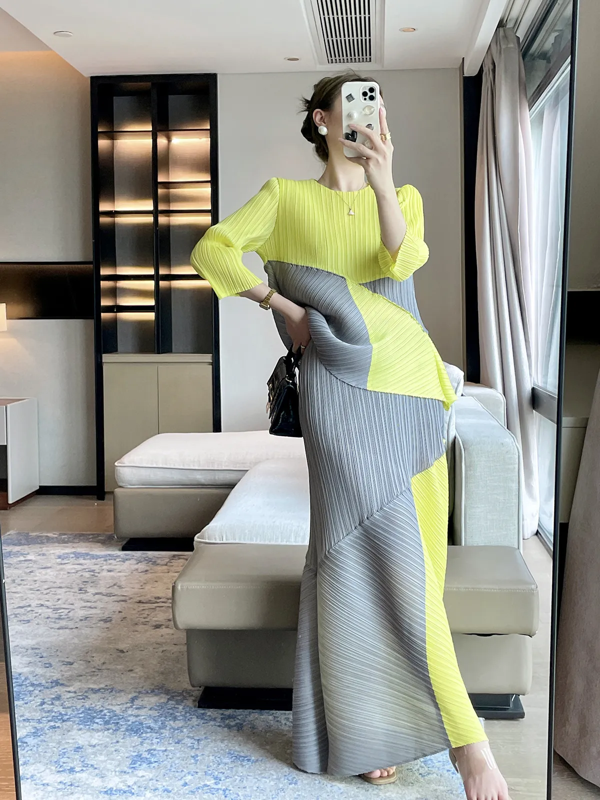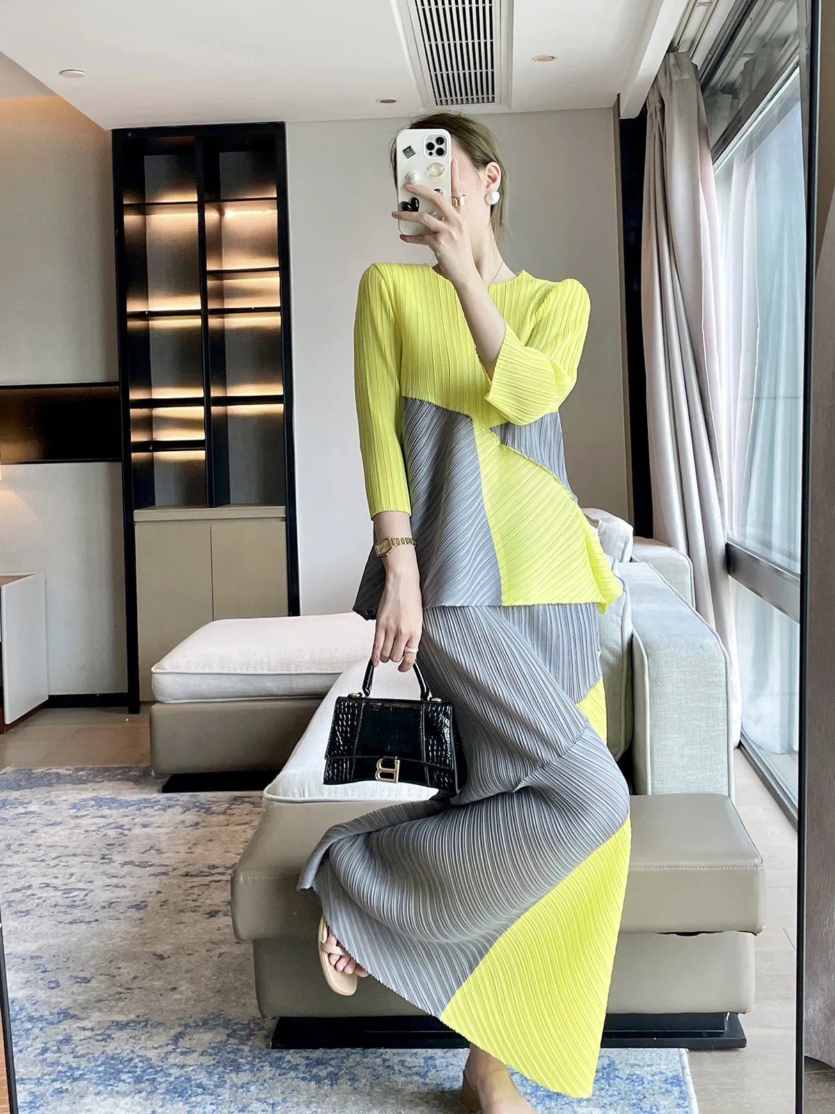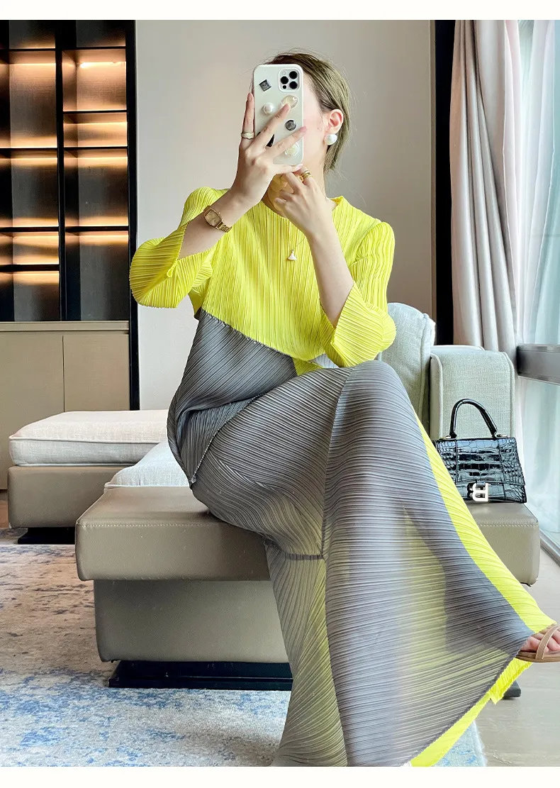 衣都精品- 2023新款拼色時尚休閒氣質優雅上衣+半身裙兩件式褶皺套裝