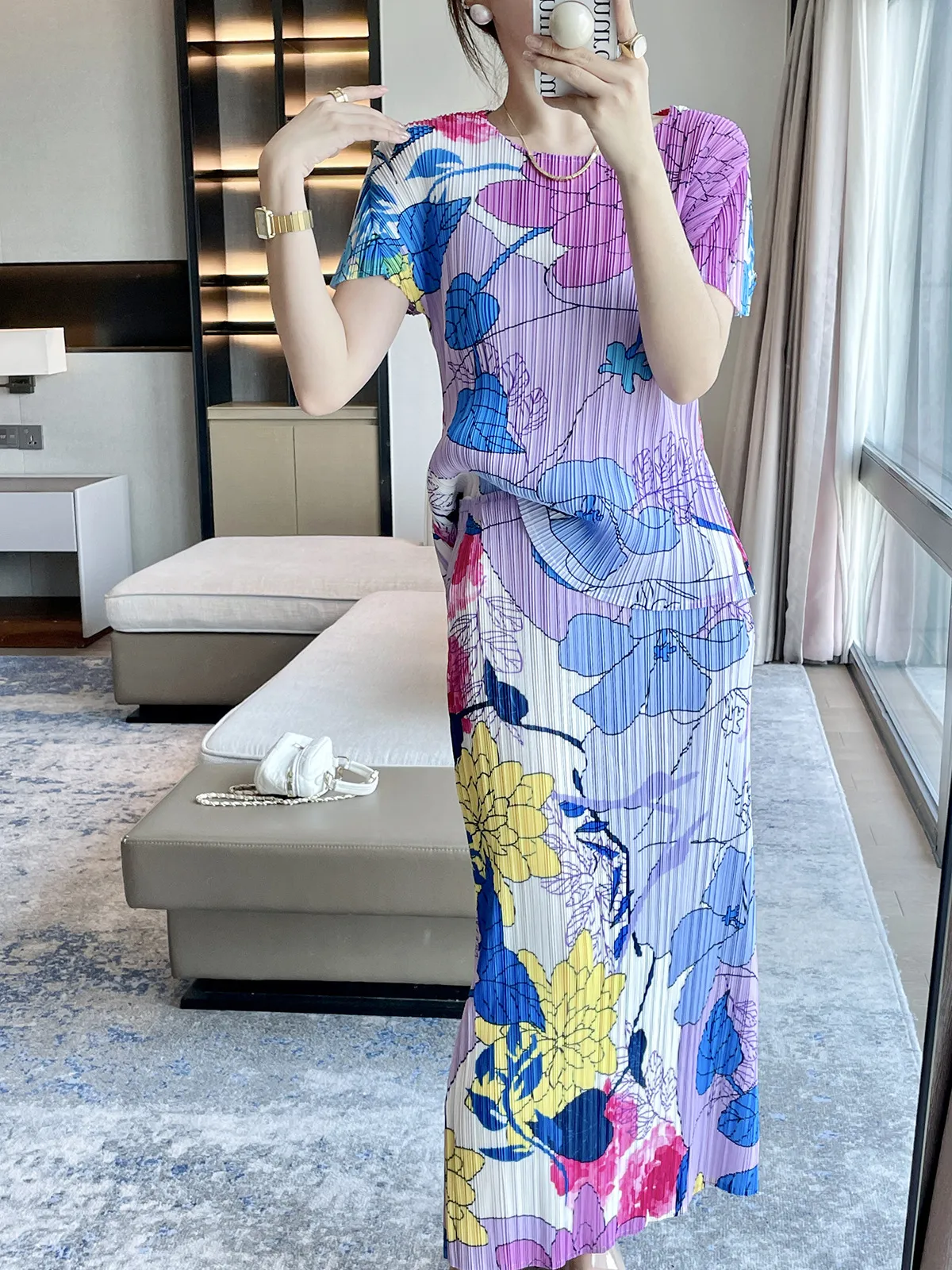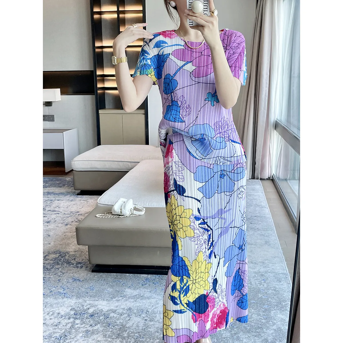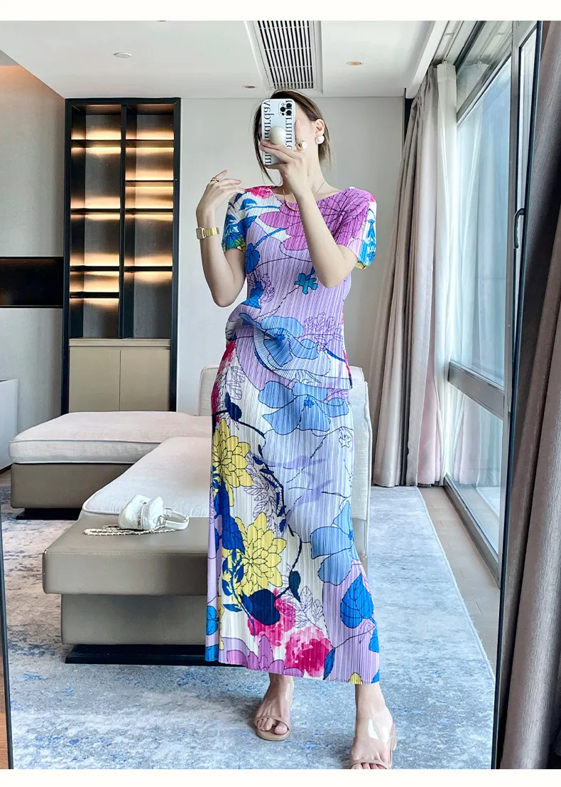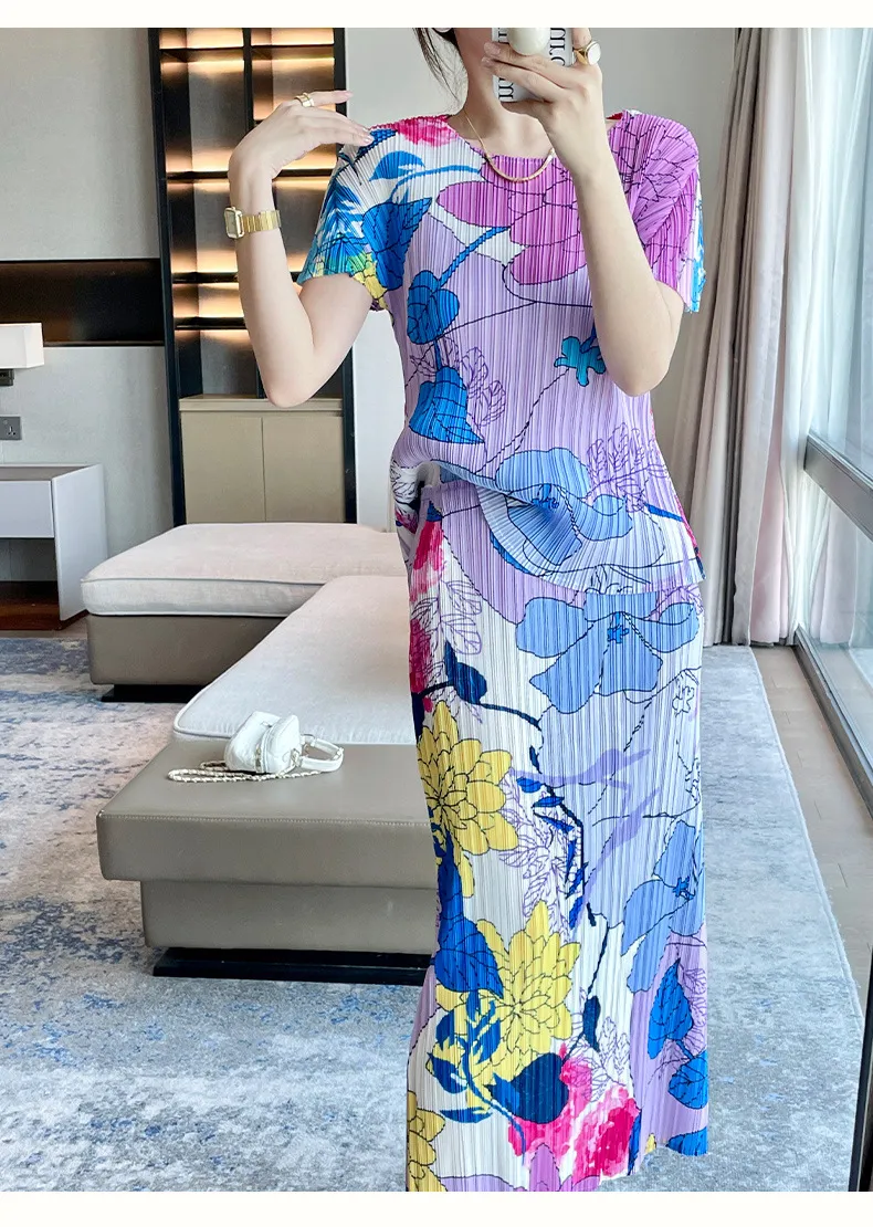 衣都精品- 2023新款氣質印花時尚休閒上衣+半身裙兩件式褶皺套裝