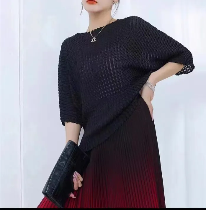 衣都精品- 2023新款重工壓褶高貴純色休閒七分袖褶皺上衣