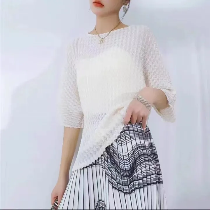 衣都精品- 2023新款重工壓褶高貴純色休閒七分袖褶皺上衣