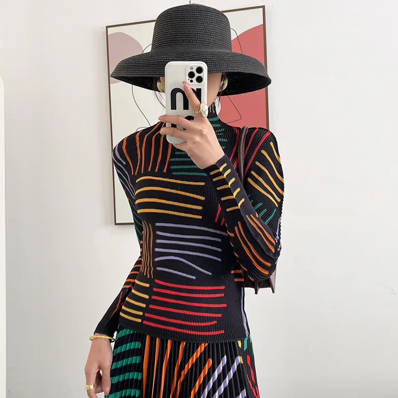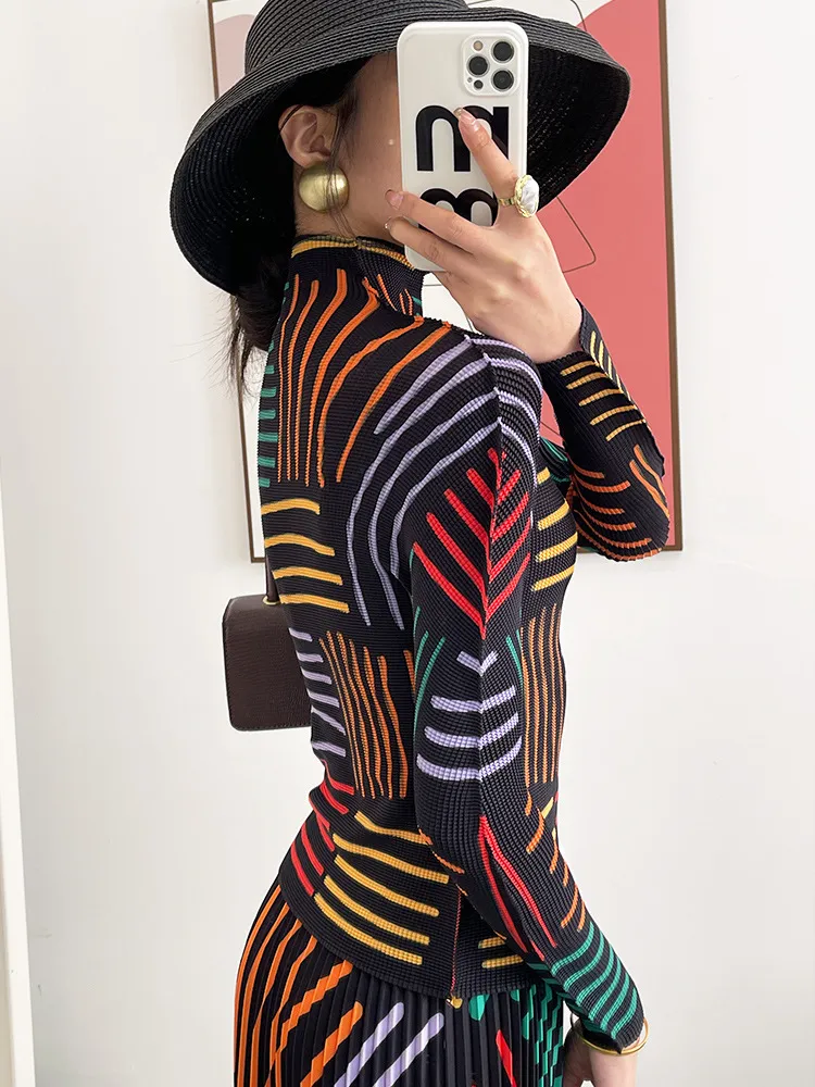 衣都精品- 2023新款復古百褶線條印花修身褶皺上衣