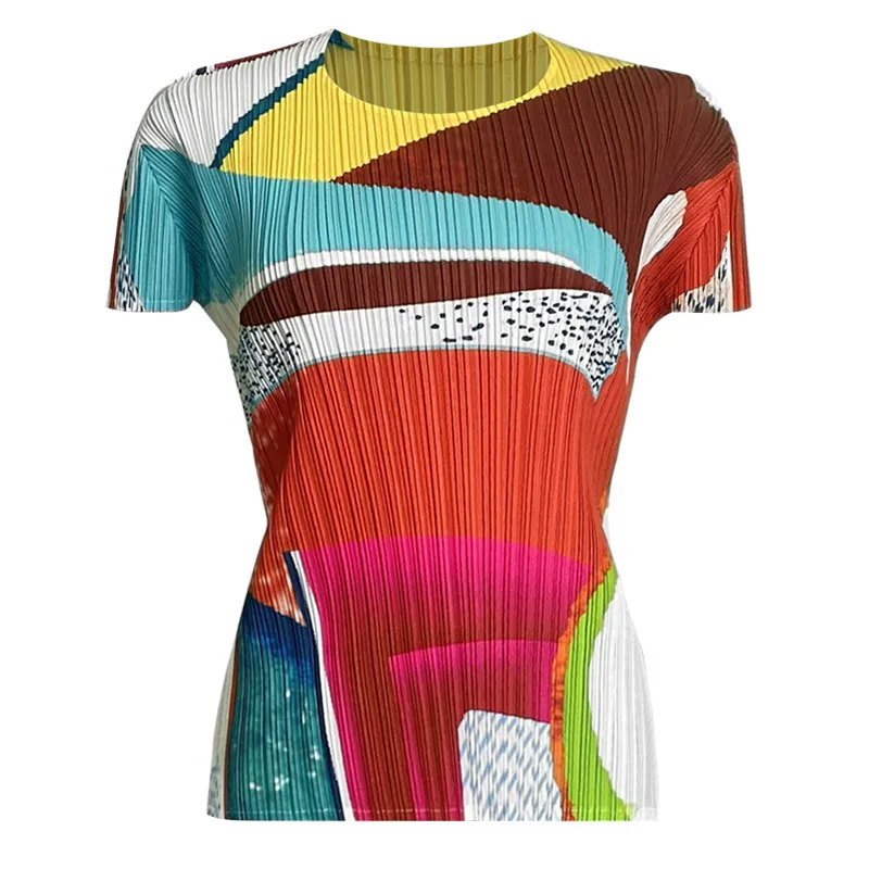 衣都精品- 2023新款韓版時尚百搭休閒印花短袖褶皺上衣