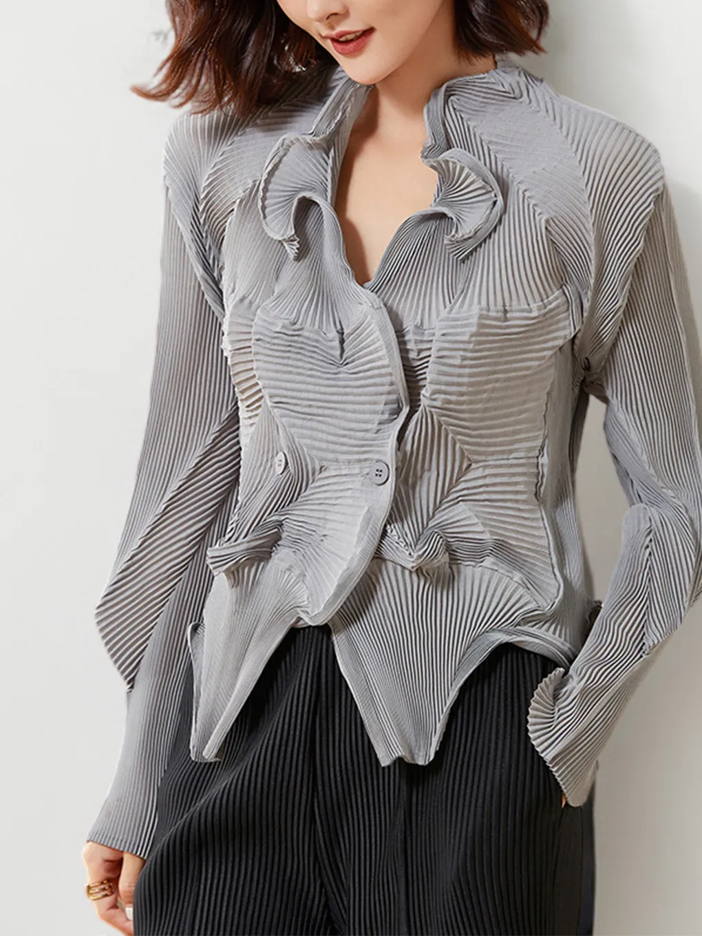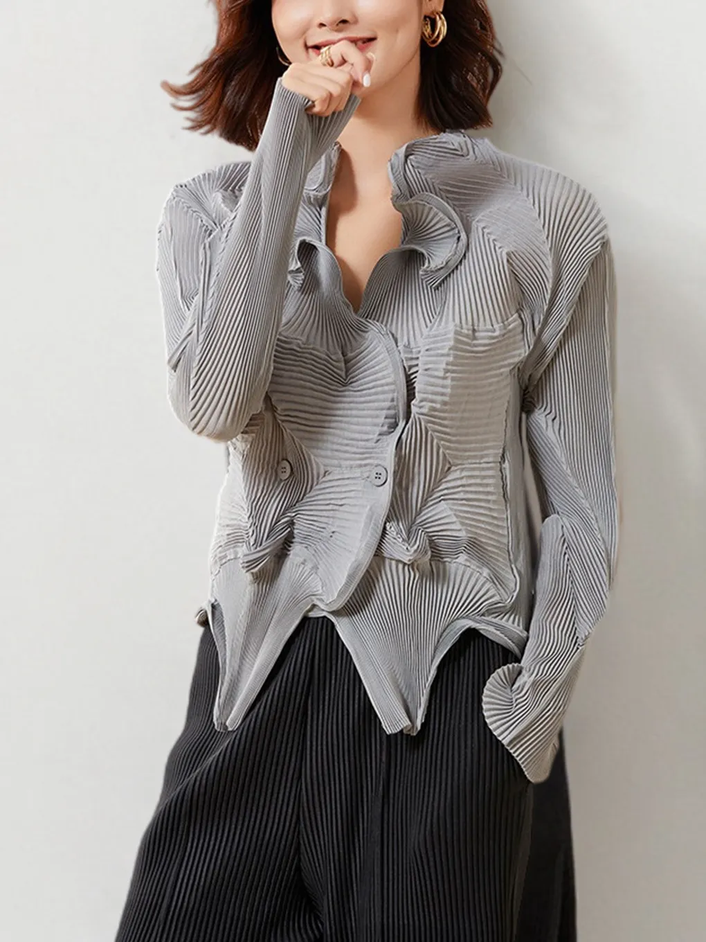 衣都精品- 2023新款長袖休閒百搭單排扣開襟褶皺上衣