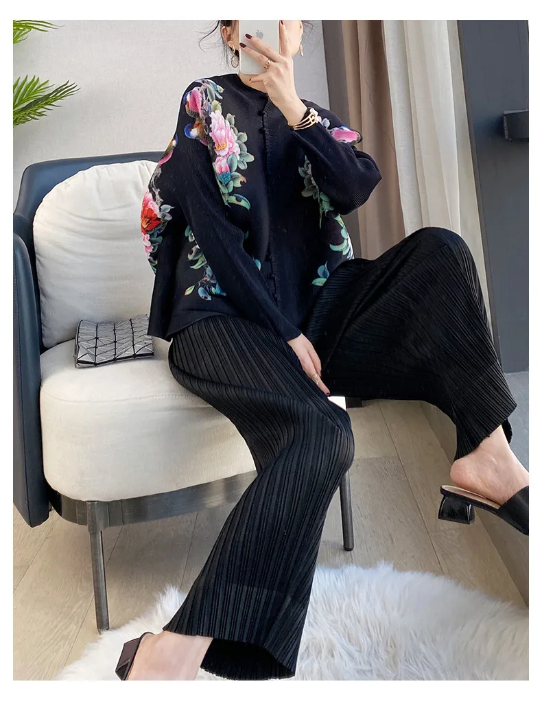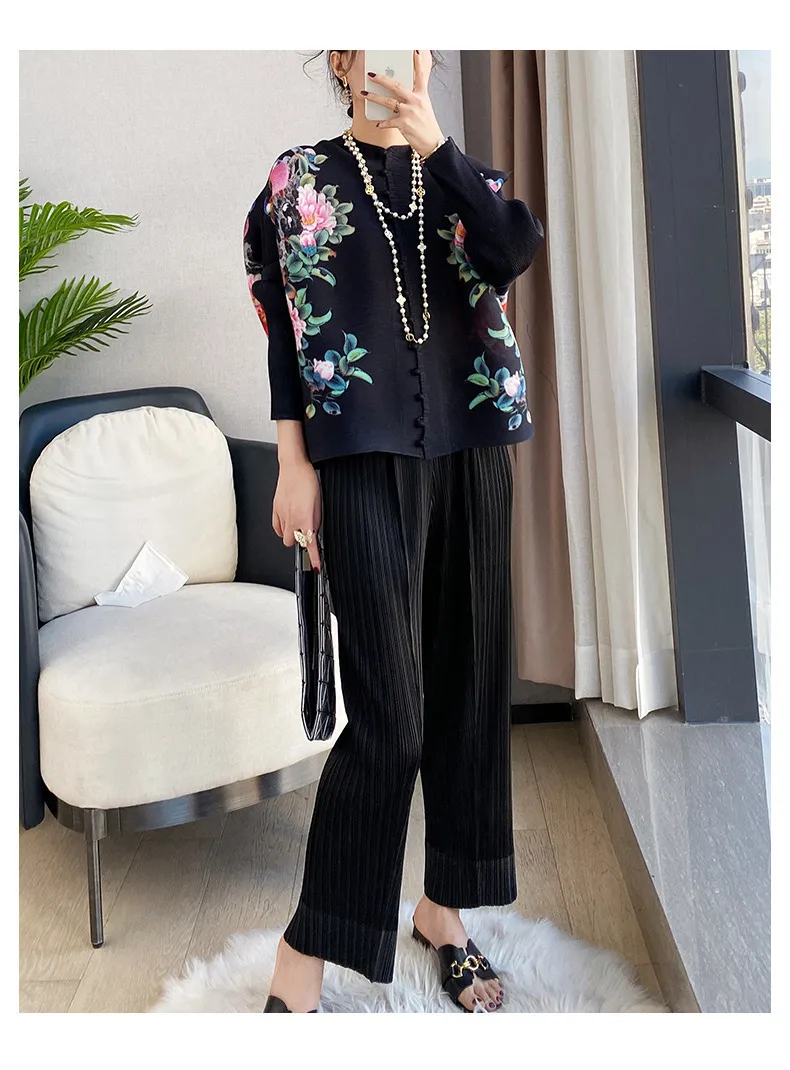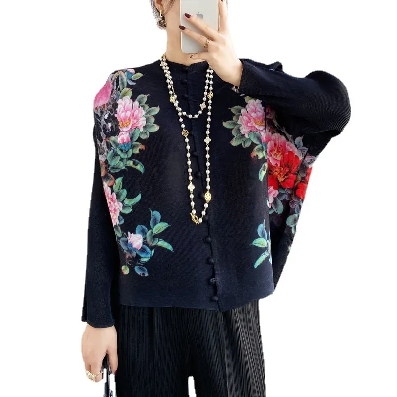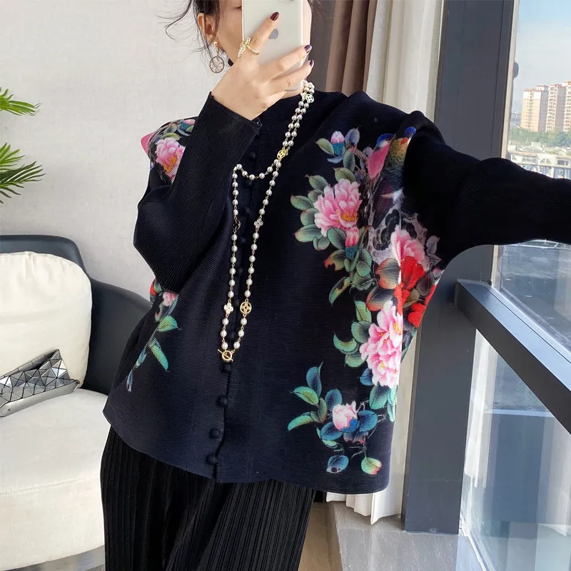 衣都精品- 2024新款中國風印花長袖寬鬆貴夫人褶皺上衣
