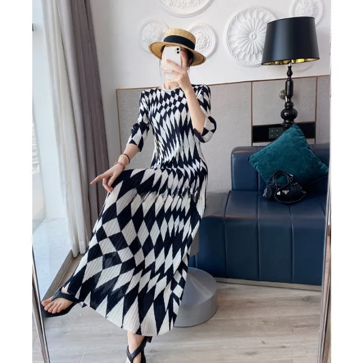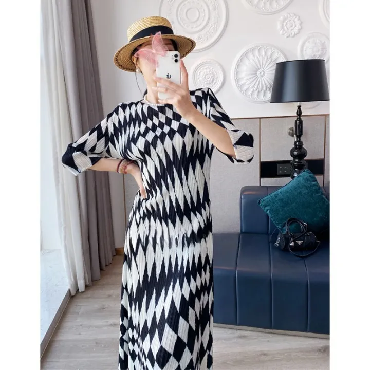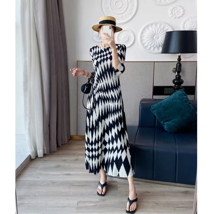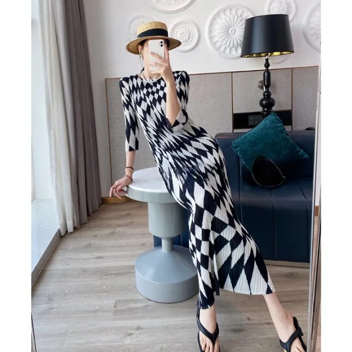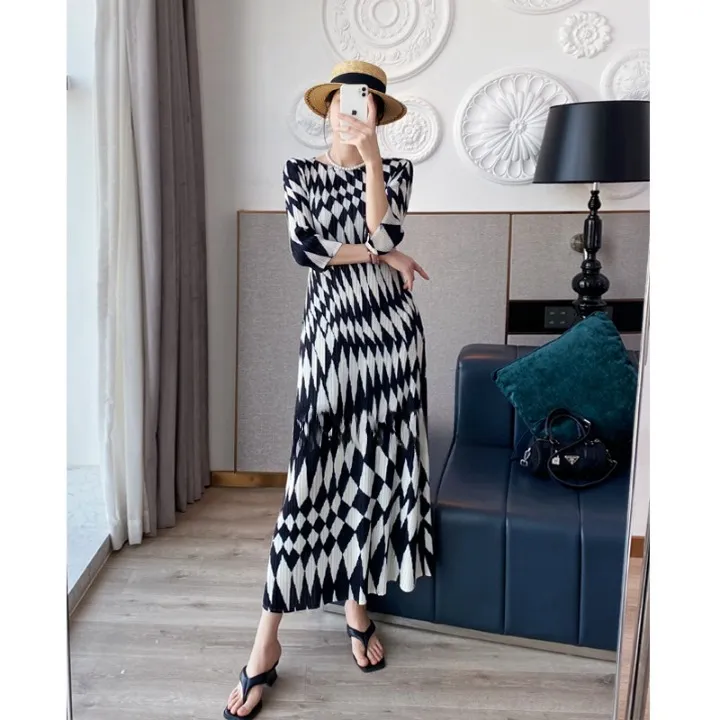 衣都精品- 2024新款薄款菱形格印花百搭典雅褶皺連衣裙