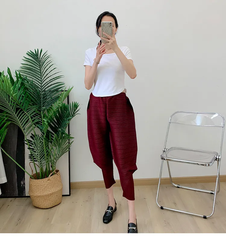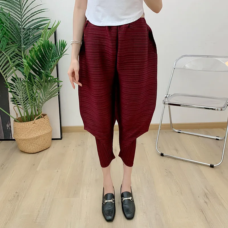 衣都精品- 2024新款寬鬆薄款鬆緊腰小腳九分褶皺哈倫褲