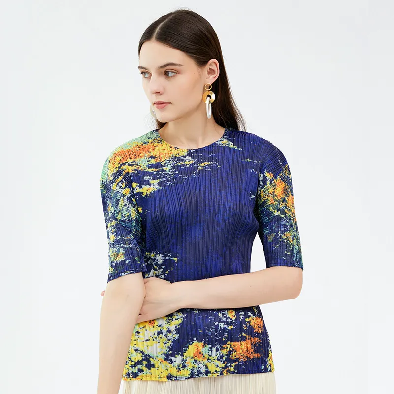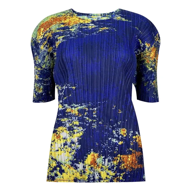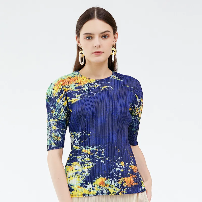 衣都精品- 2023新款圓領百搭小眾星空印花褶皺上衣