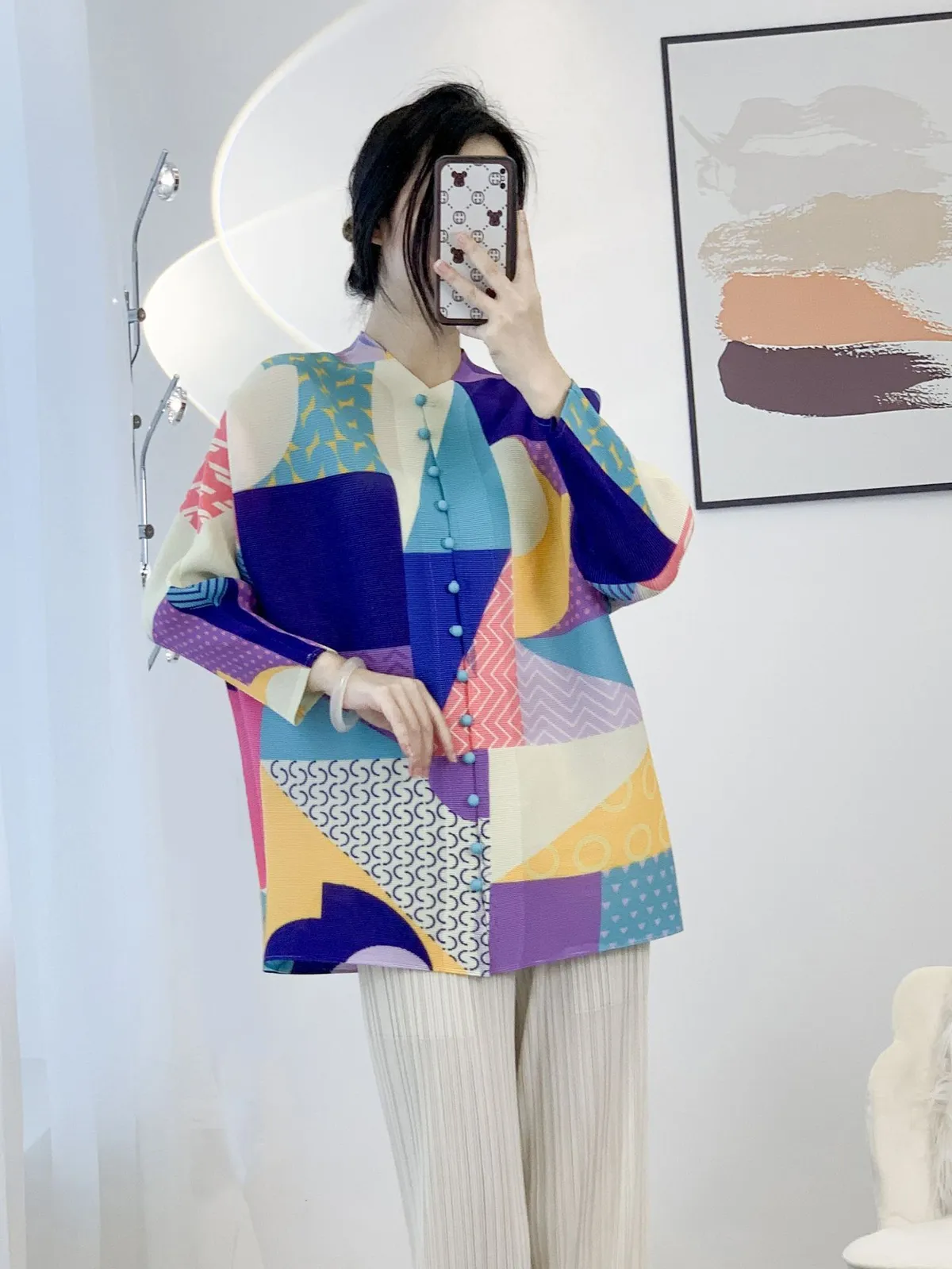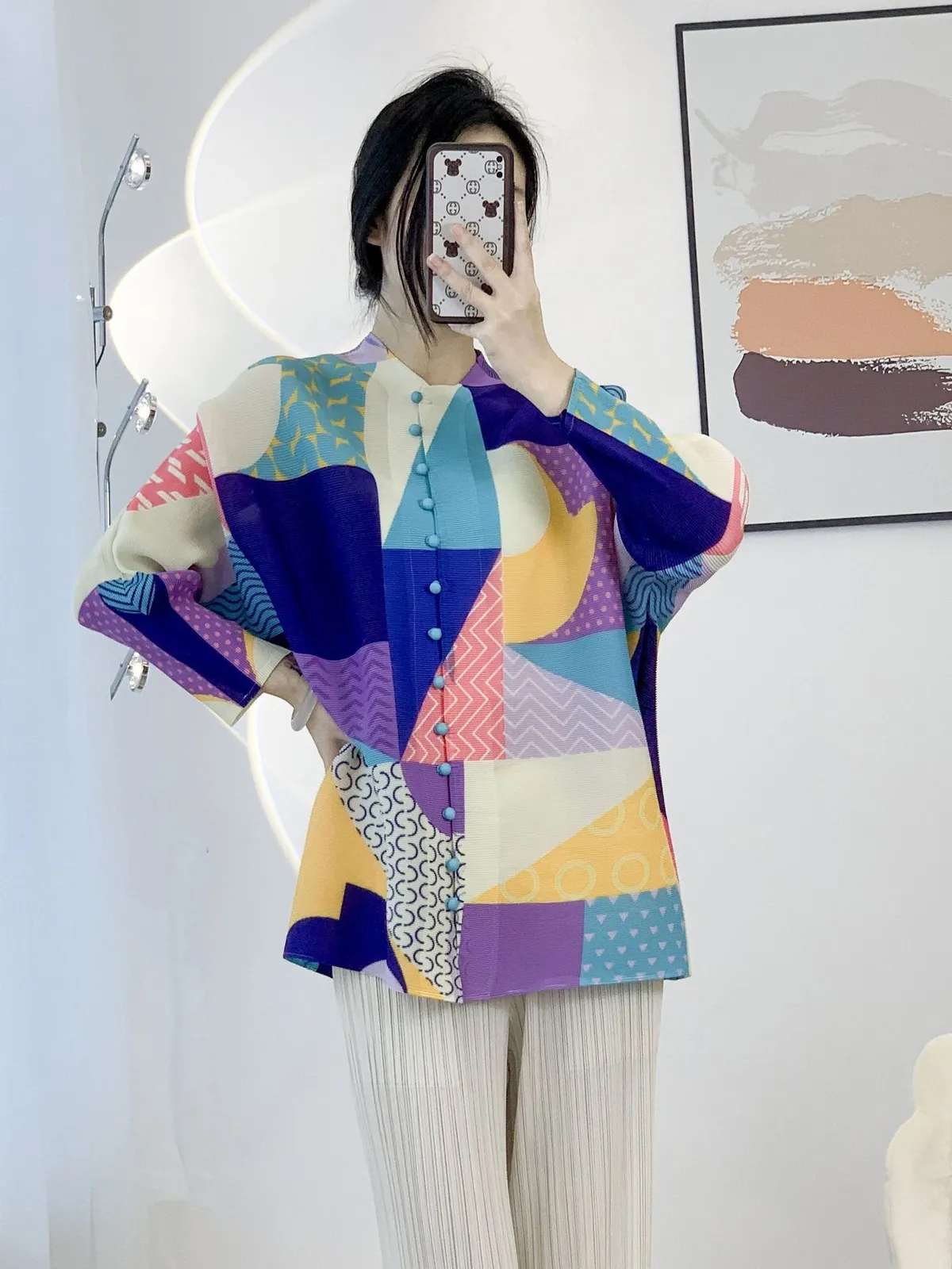 衣都精品- 2023新款幾何印花時尚小包扣褶皺外套