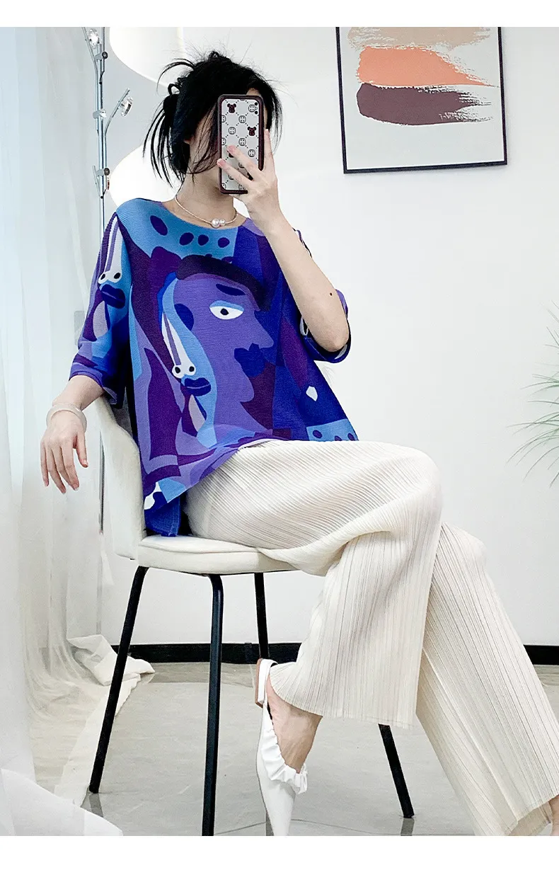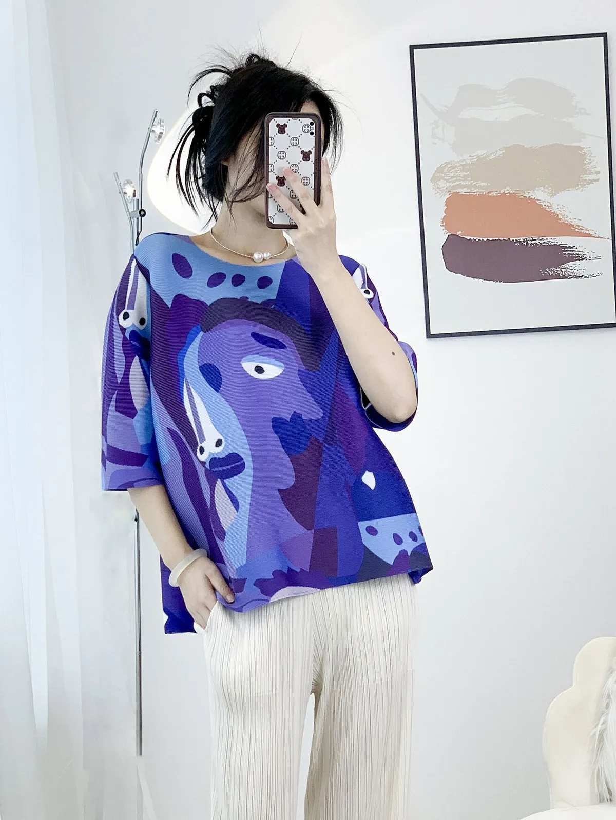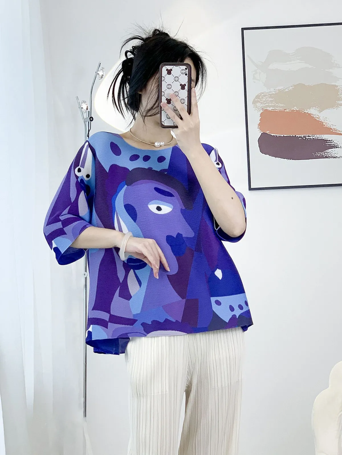 衣都精品- 2023新款半袖時尚印花寬鬆圓領短款褶皺上衣