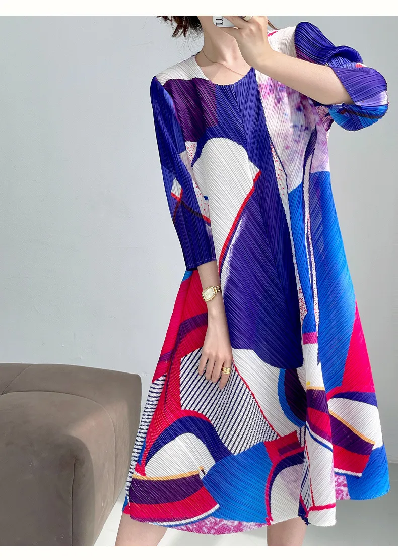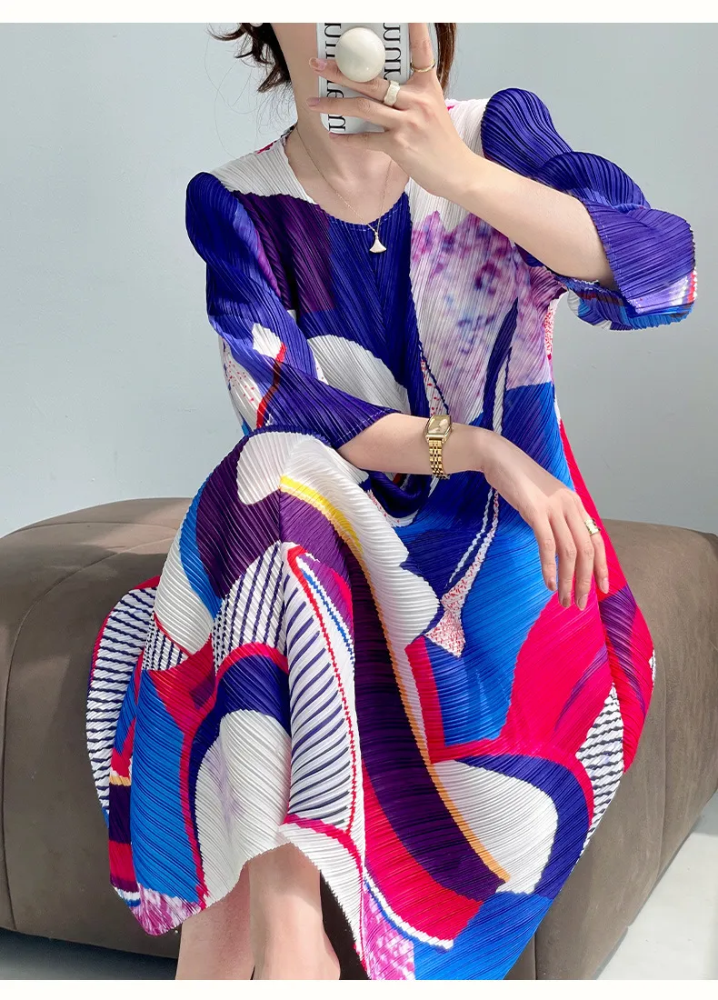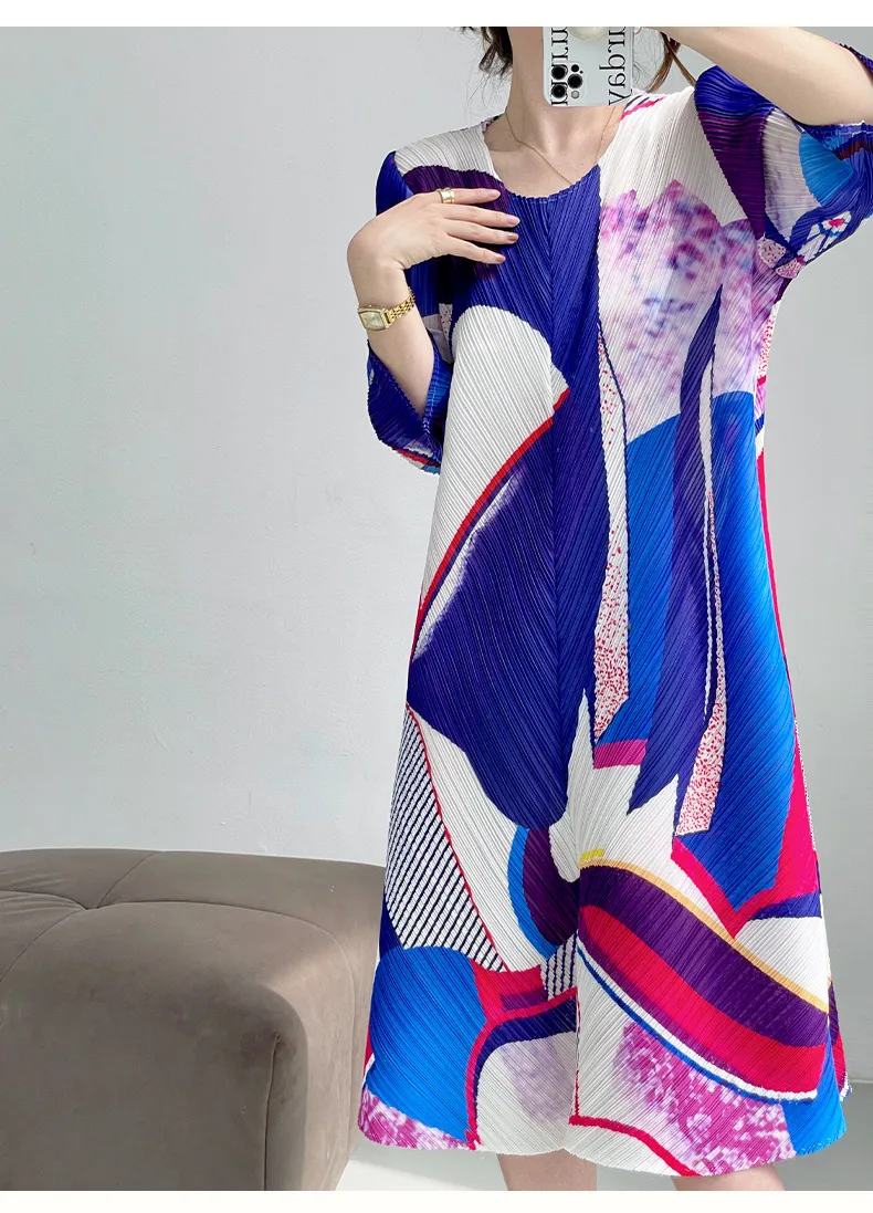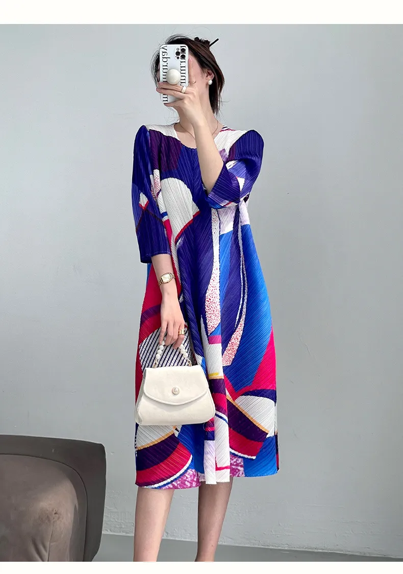 衣都精品- 2023新款時尚幾何印花圓領寬鬆褶皺連衣裙
