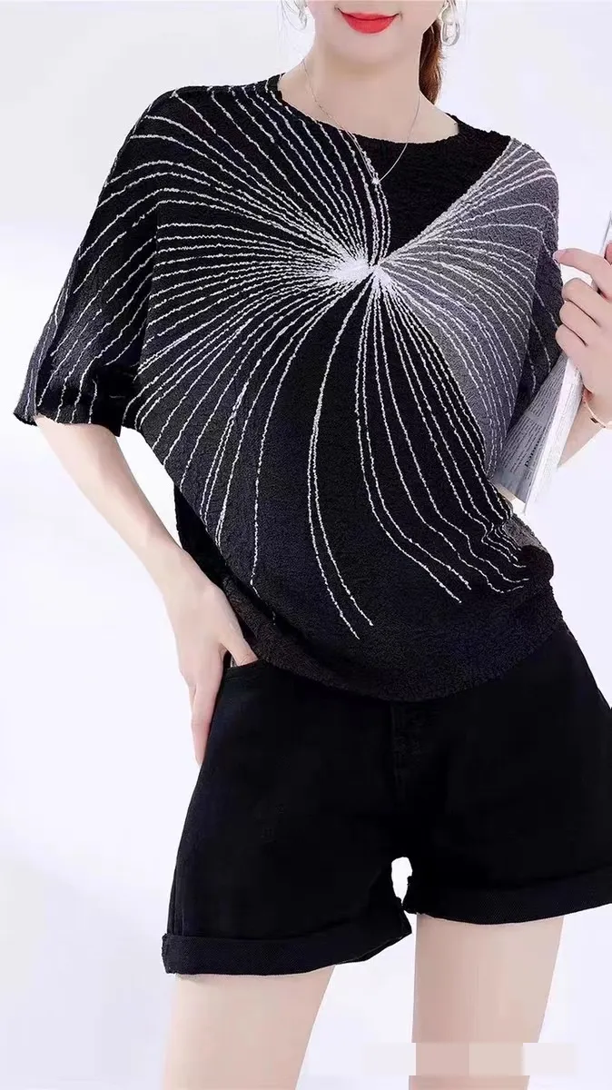 衣都精品- 2023新款高端氣質印花寬鬆親膚蝙蝠袖褶皺上衣