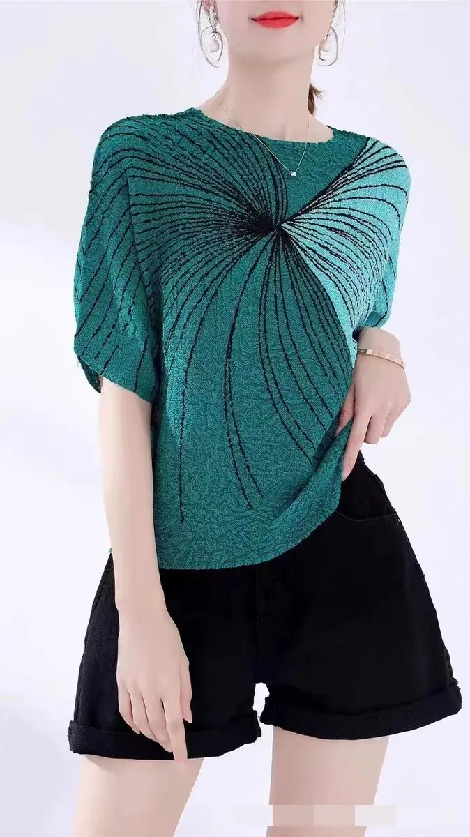 衣都精品- 2023新款高端氣質印花寬鬆親膚蝙蝠袖褶皺上衣