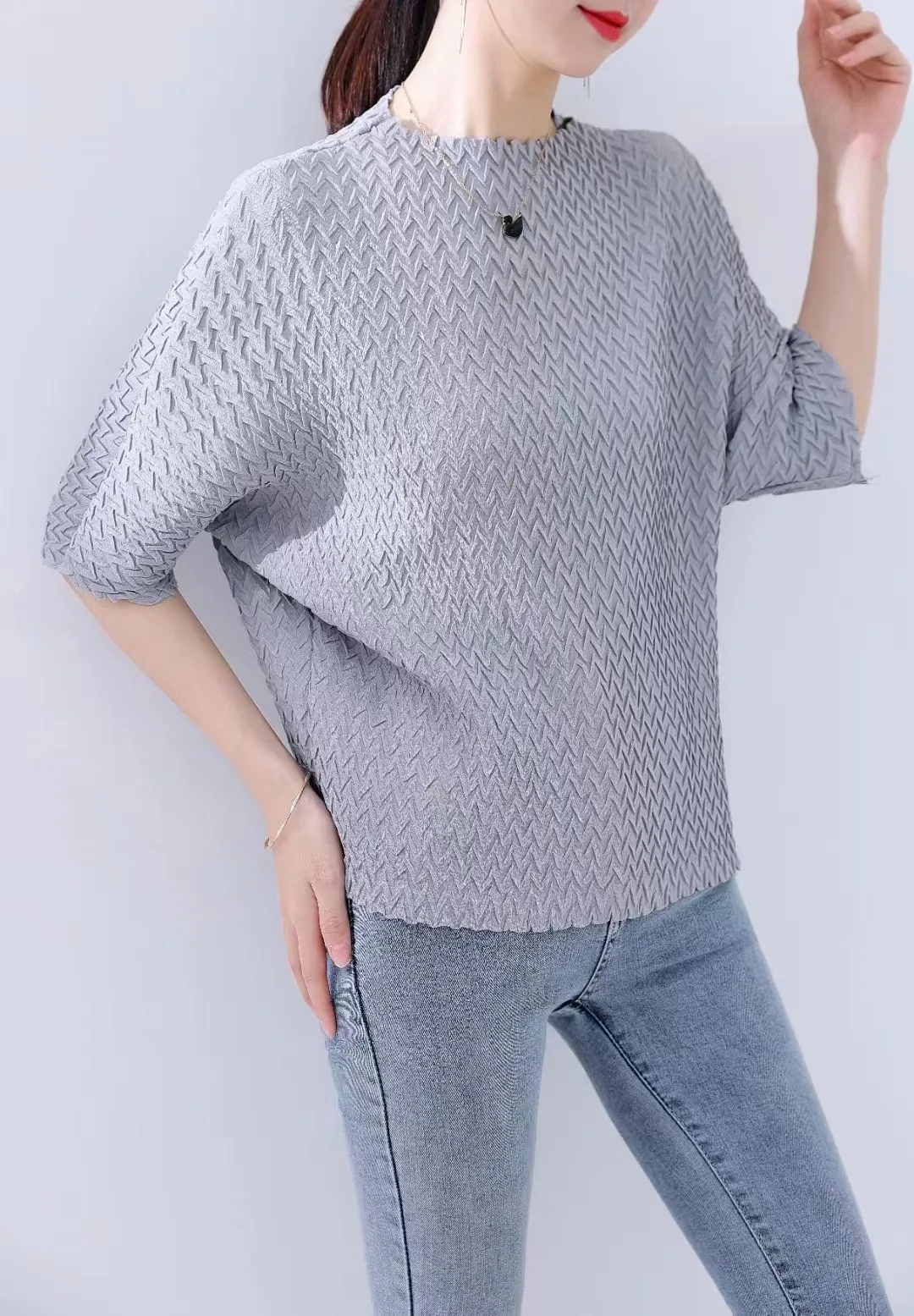 衣都精品- 2023新款高端氣質印花寬鬆親膚蝙蝠袖褶皺上衣