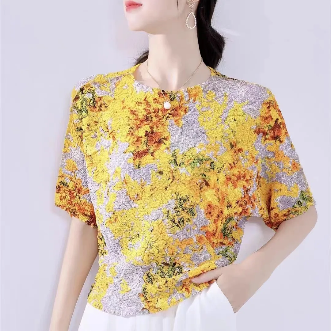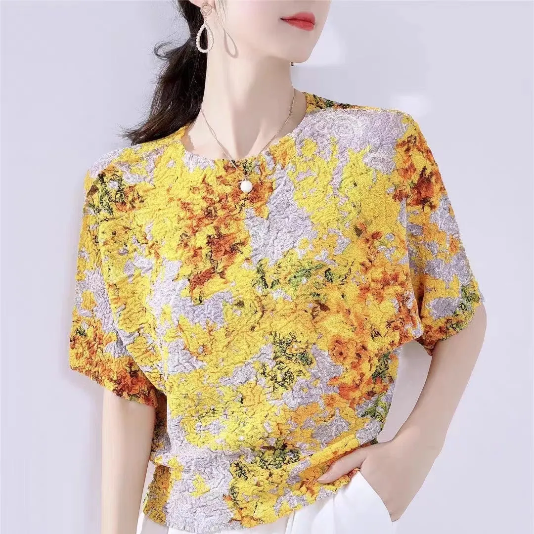 衣都精品- 2023新款高端氣質印花寬鬆親膚蝙蝠袖褶皺上衣