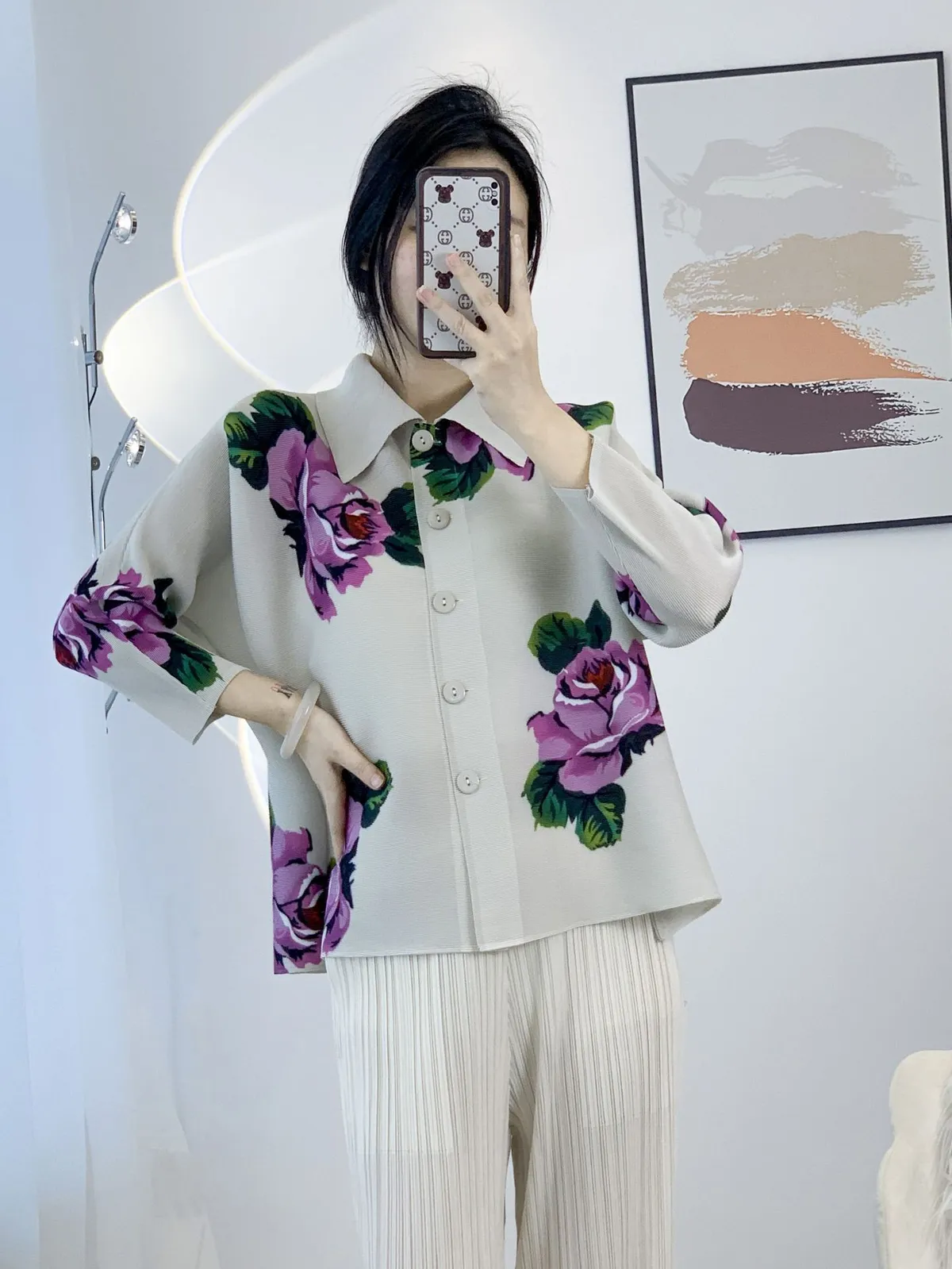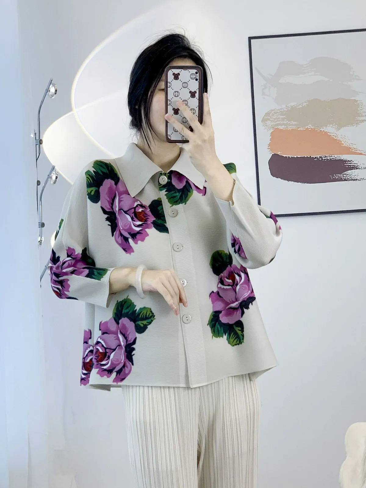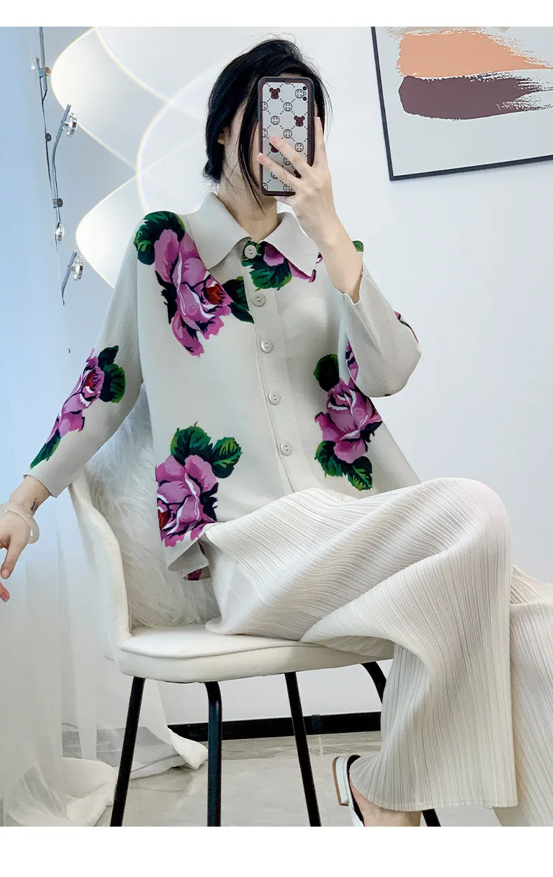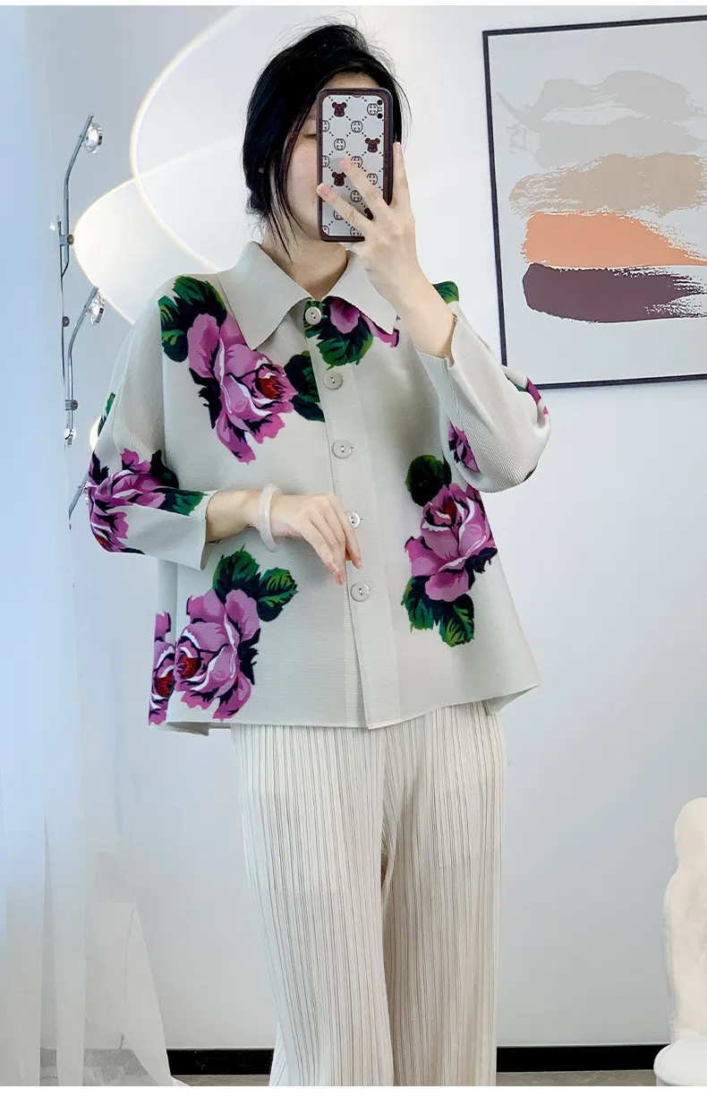 衣都精品- 2024新款氣質玫瑰印花時尚翻領褶皺外套