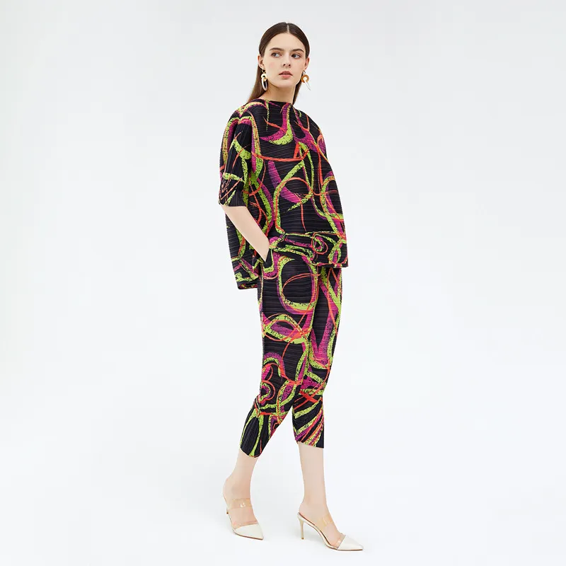 衣都精品- 2024新款高級拼色印花外貿修身褶皺連衣裙