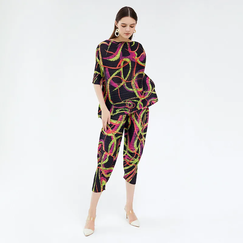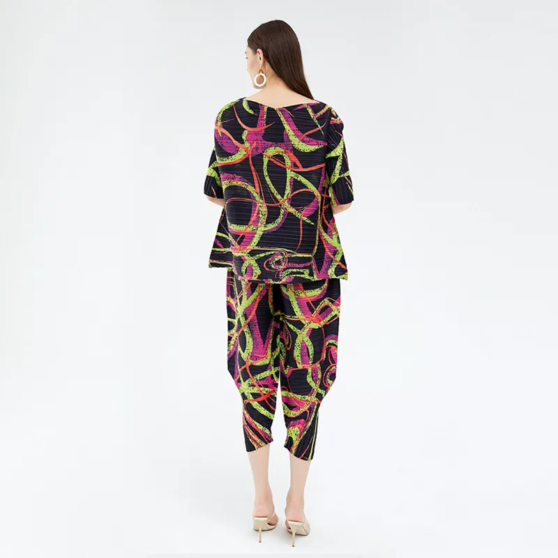 衣都精品- 2024新款時尚印花圓領修身菱角邊褶皺連衣裙