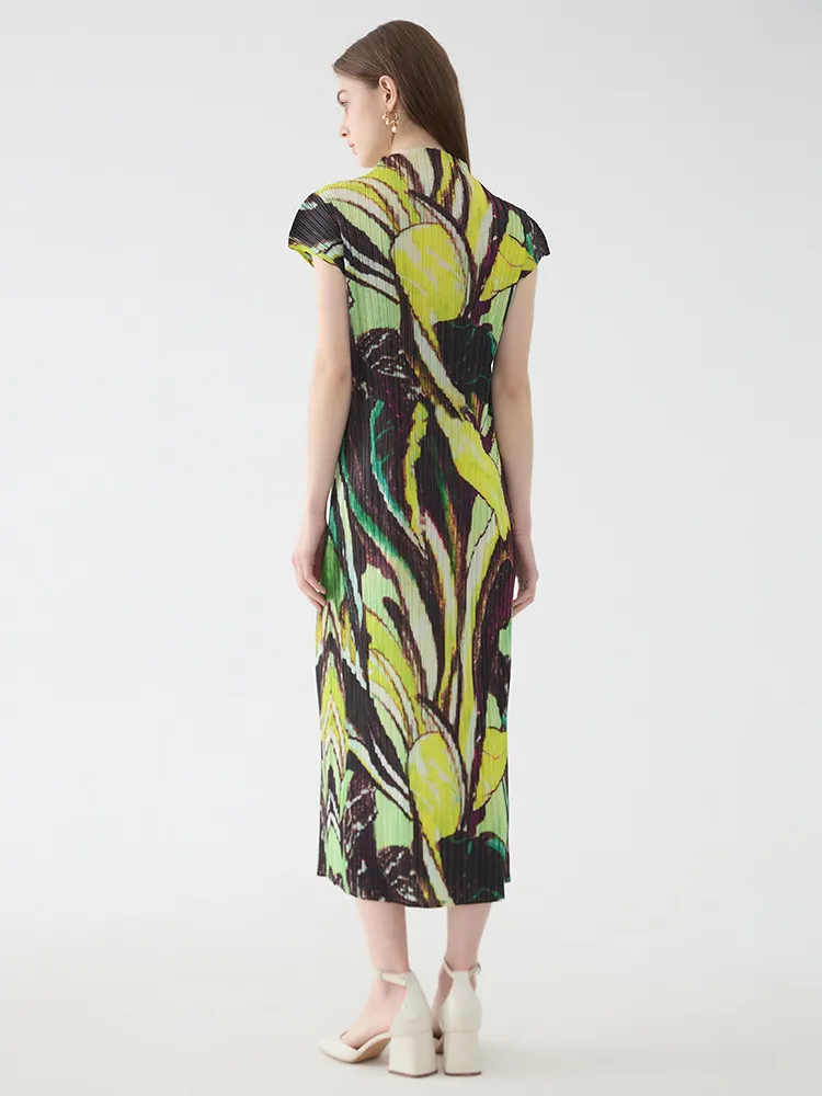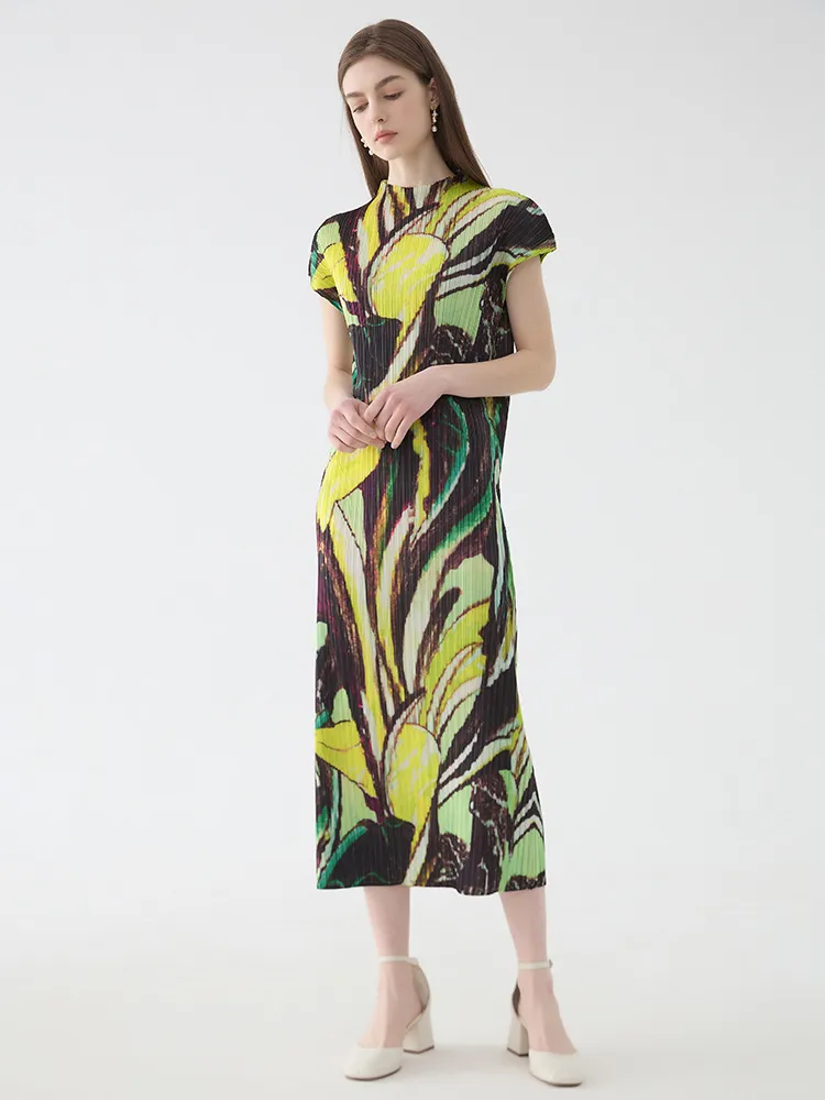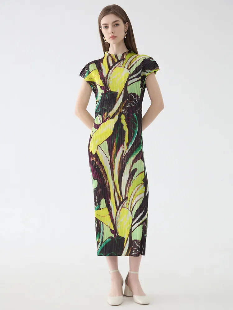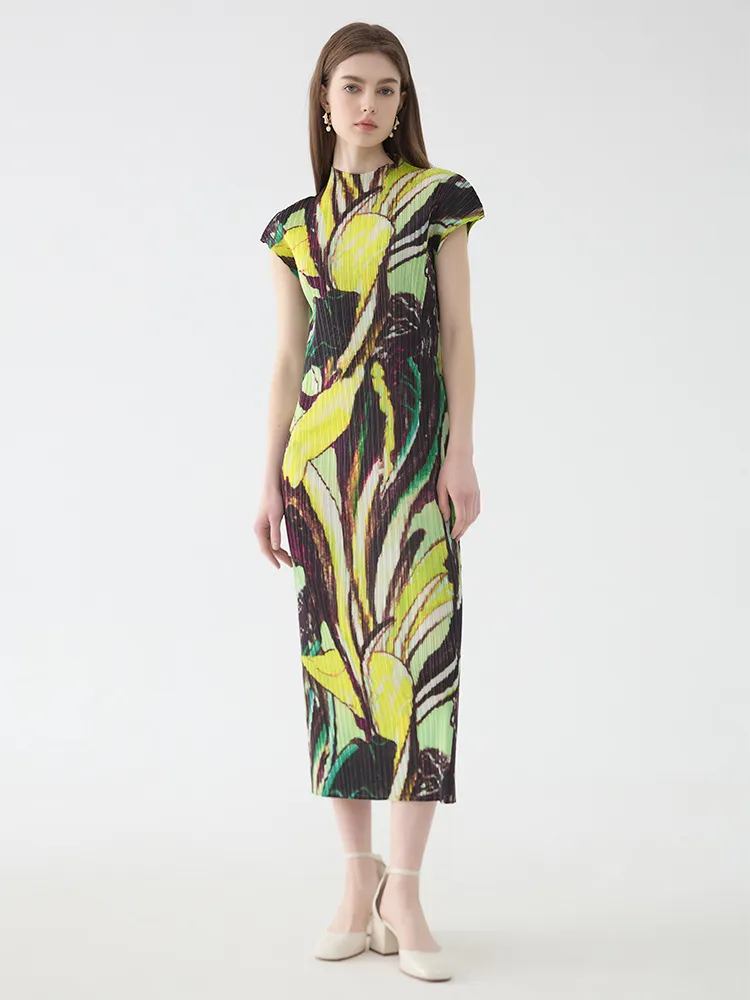 衣都精品- 2024新款韓版簡約修身半高領印花飛天袖褶皺連衣裙