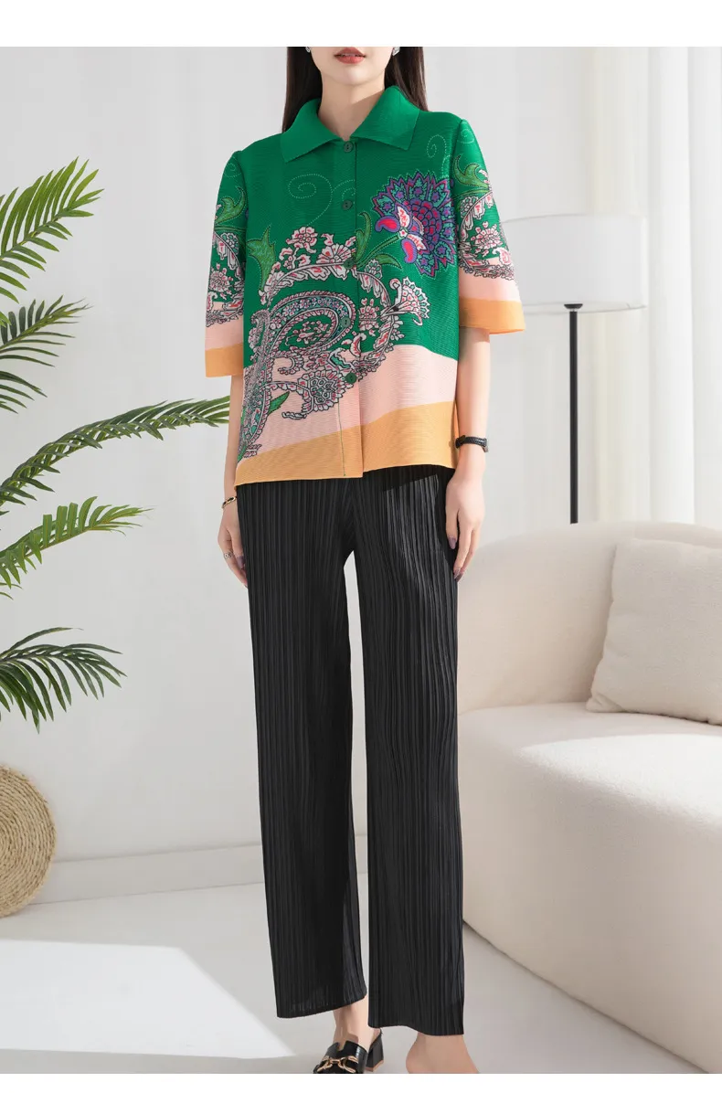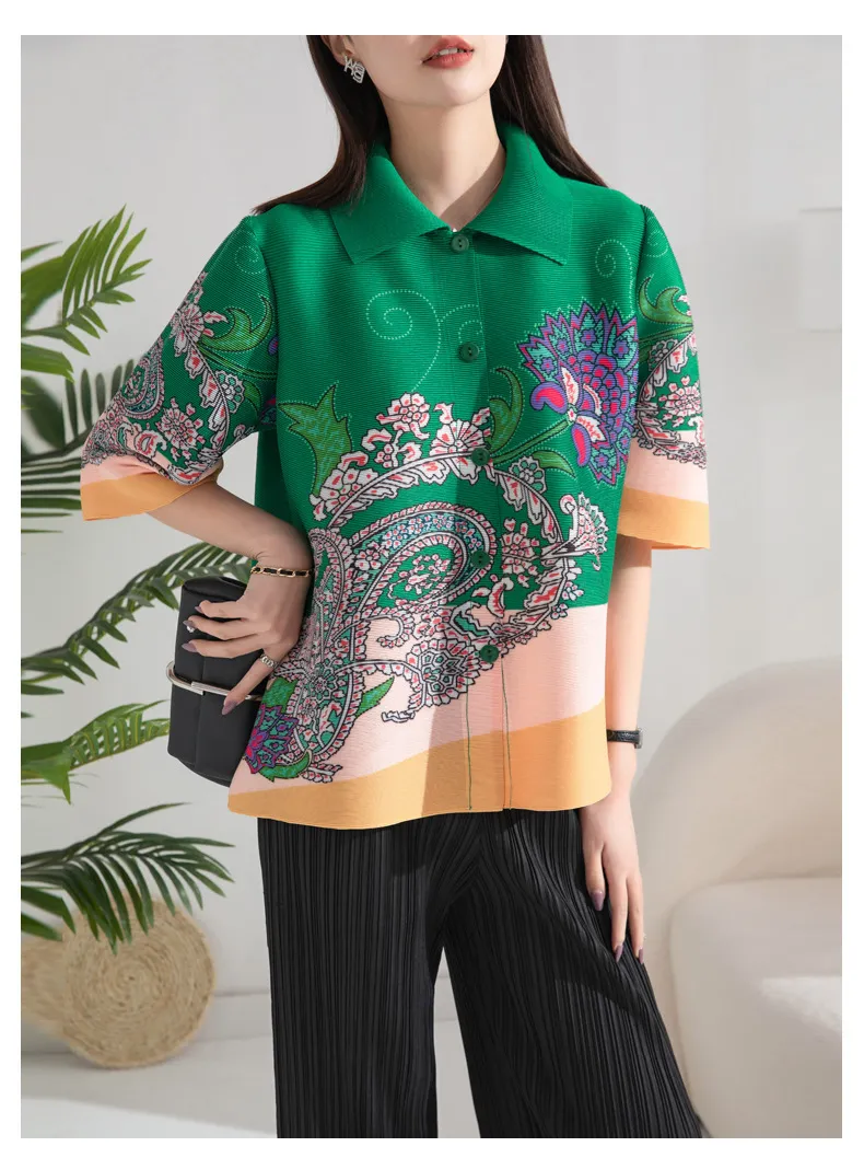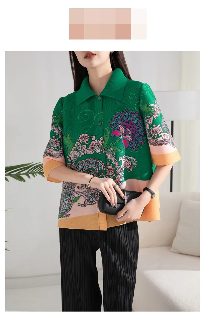 衣都精品- 2024新款印花寬鬆時尚百搭圓領七分袖褶皺上衣