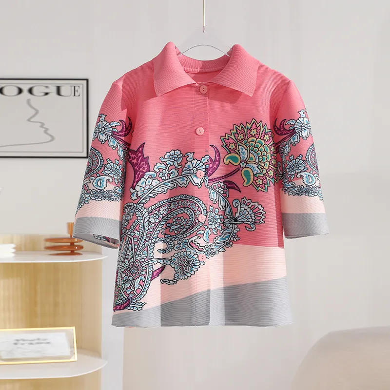 衣都精品- 2024新款印花寬鬆時尚百搭圓領七分袖褶皺上衣