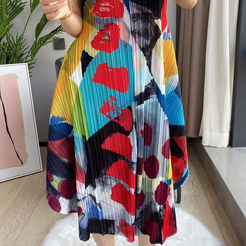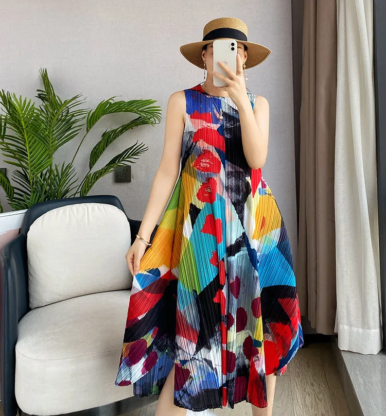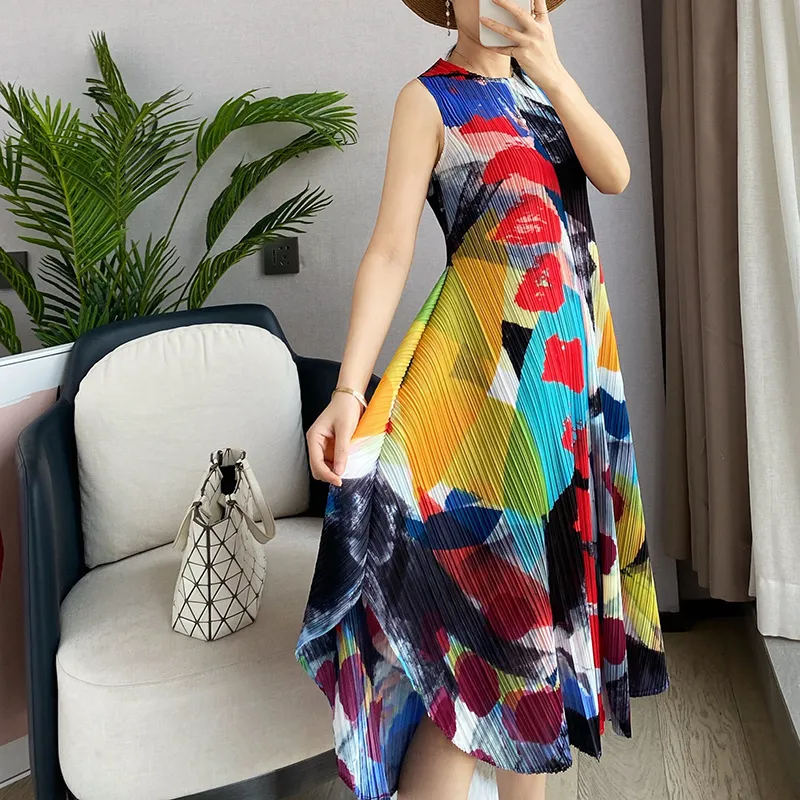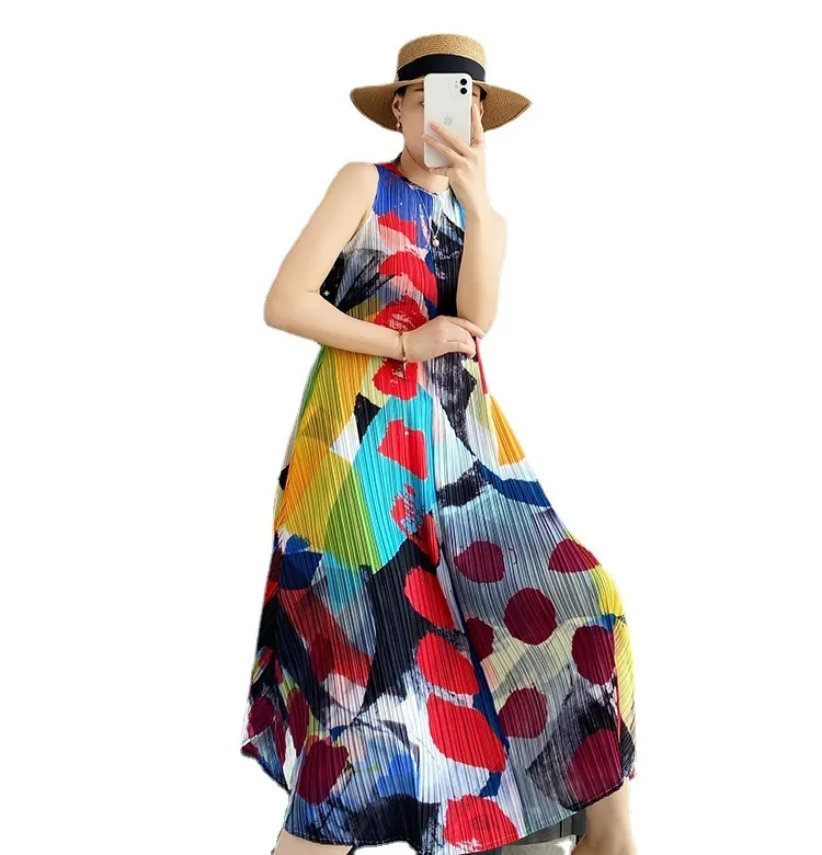 衣都精品- 新款塗鴉印花大擺中長款薄款褶皺背心裙