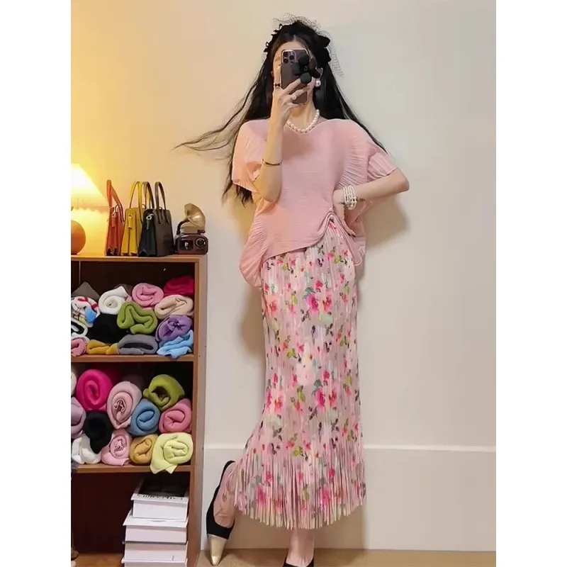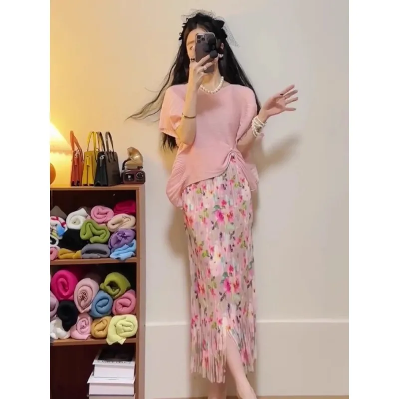 衣都精品- 新款小個子高腰氣質粉紅褶皺半身裙