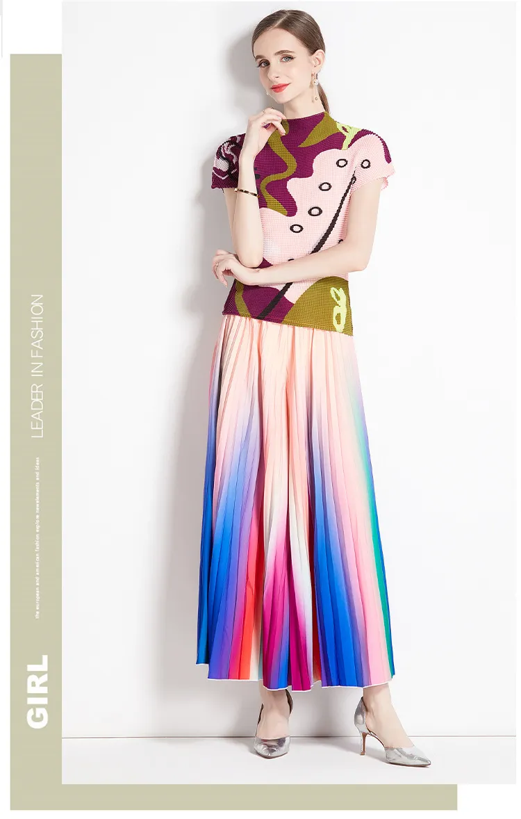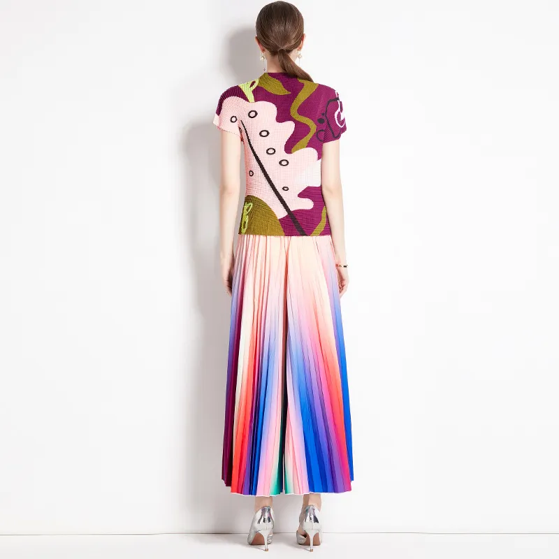 衣都精品- 新款休閒復古印花褶皺上衣+寬鬆闊腿褲兩件式套裝