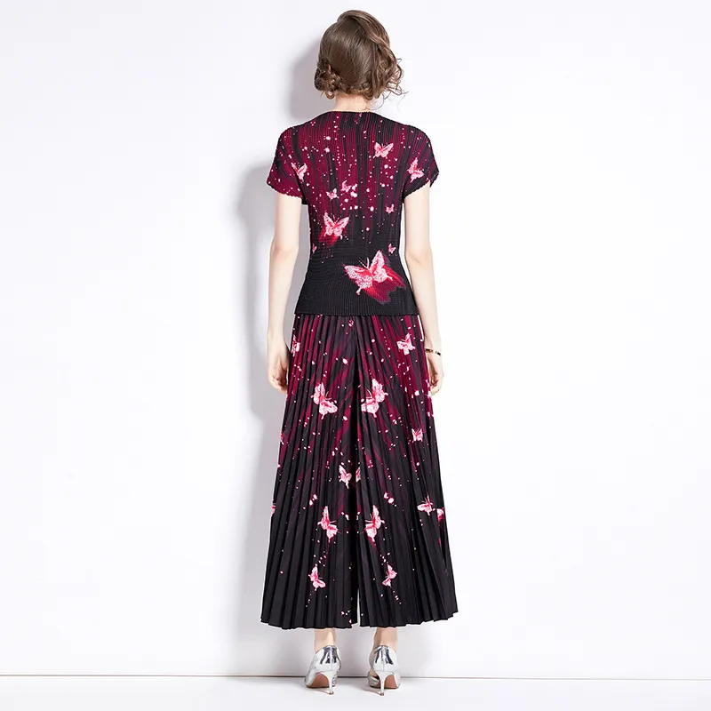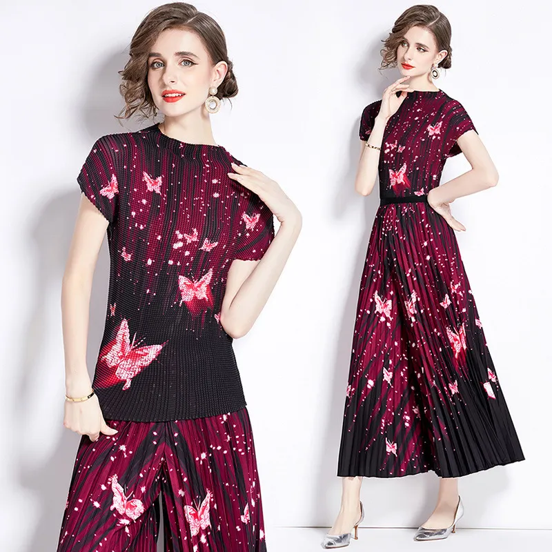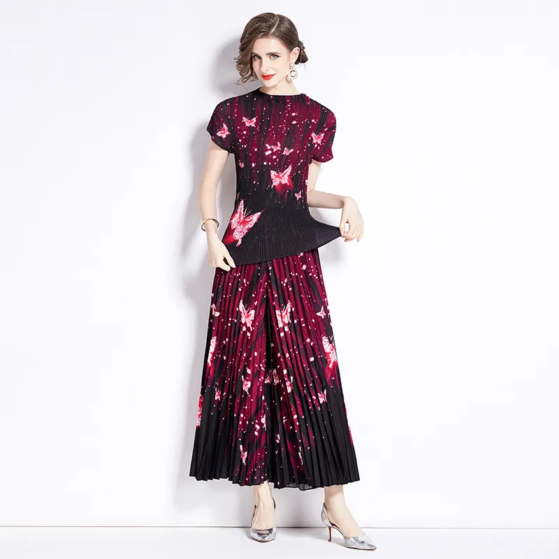 衣都精品- 新款休閒復古印花褶皺上衣+寬鬆闊腿褲兩件式套裝
