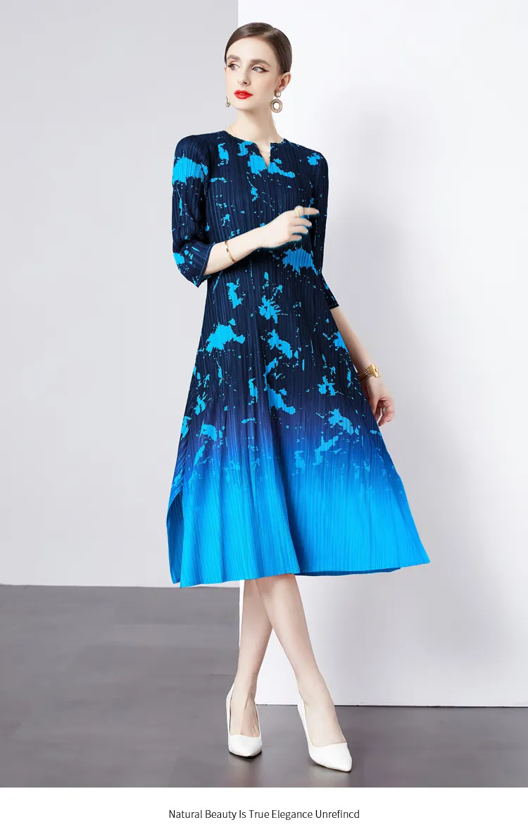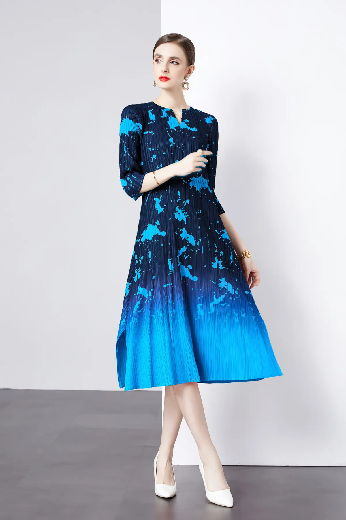 衣都精品- 新款V領時尚漸層印花氣質中長款皺褶連衣裙