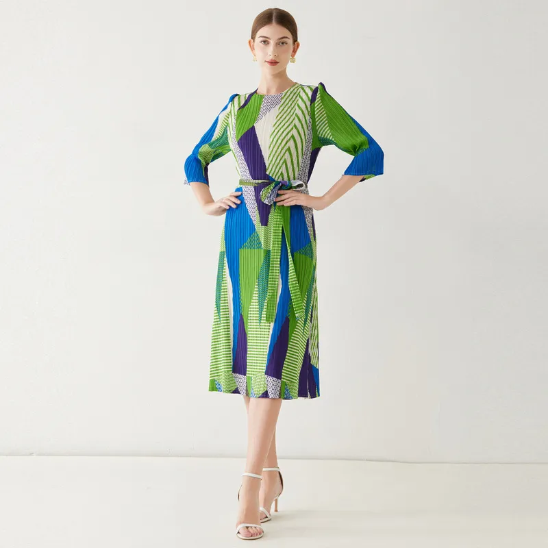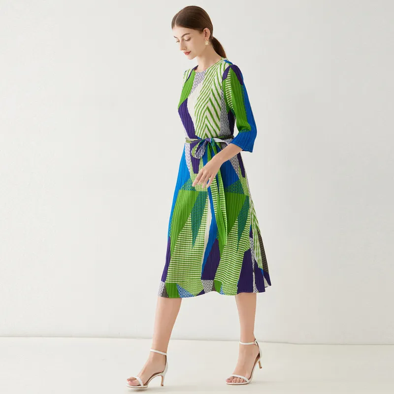 衣都精品- 新款圓領印花繫帶七分袖大碼皺褶連衣裙