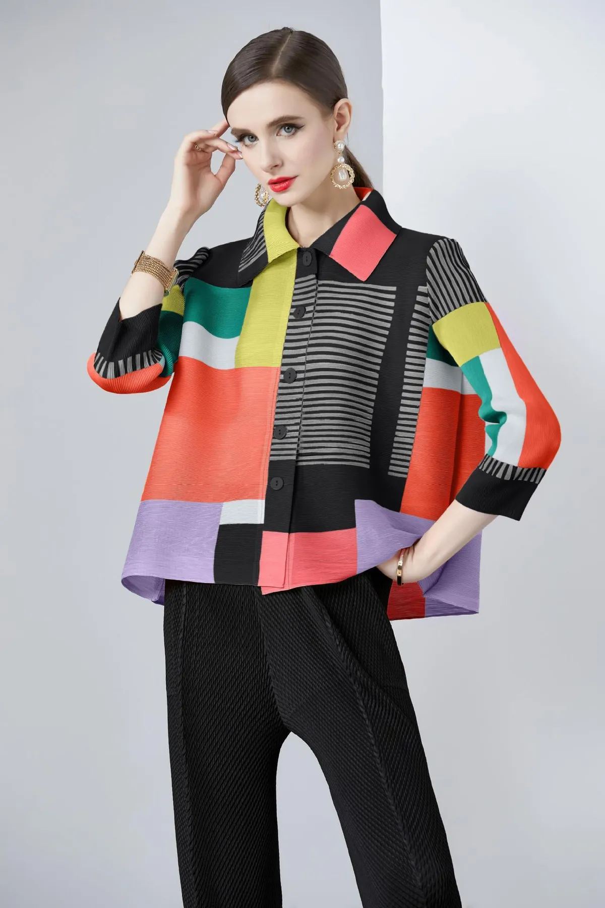 衣都精品- 新款拼色印花氣質時尚休閒皺褶外套