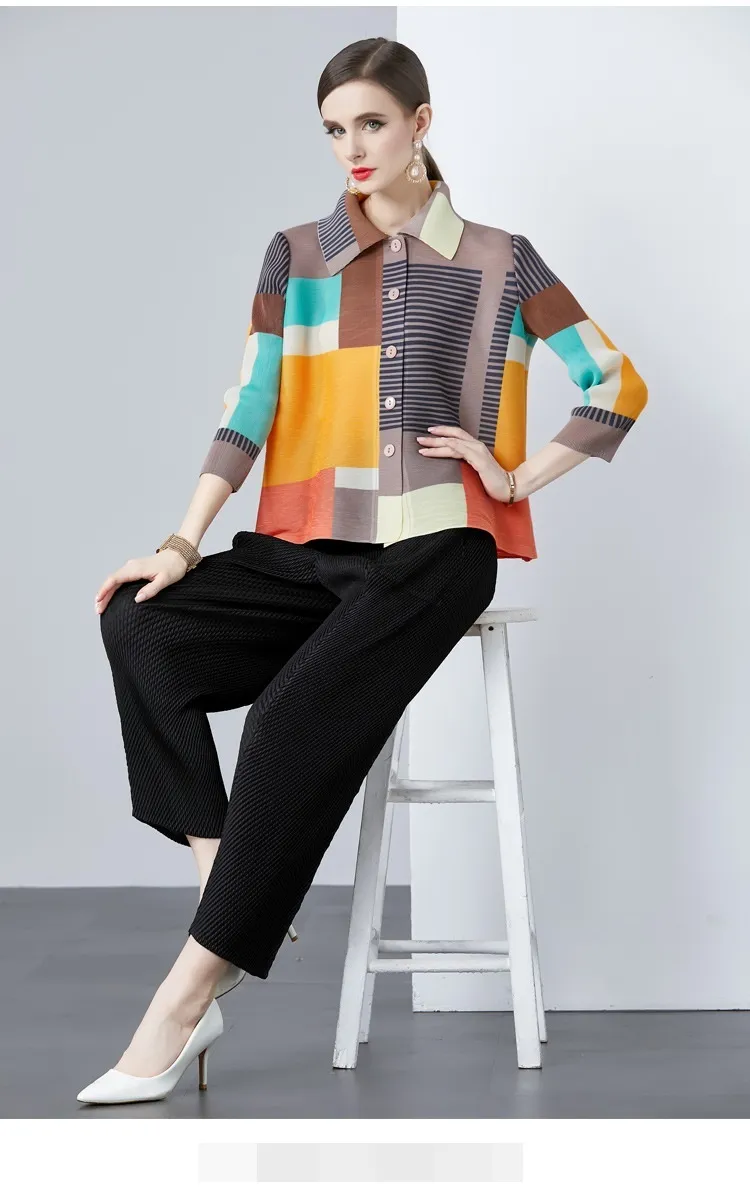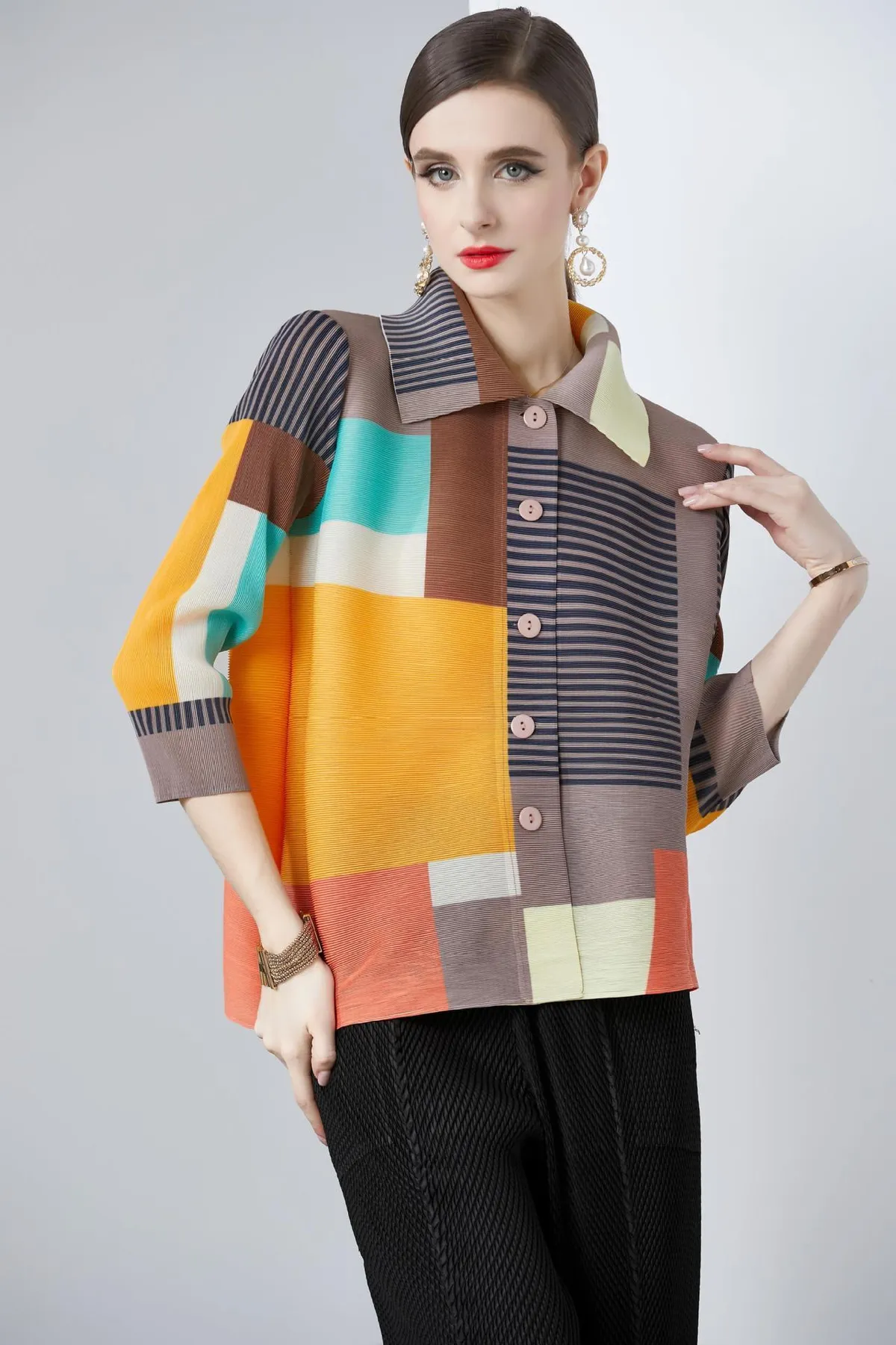 衣都精品- 新款拼色印花氣質時尚休閒皺褶外套