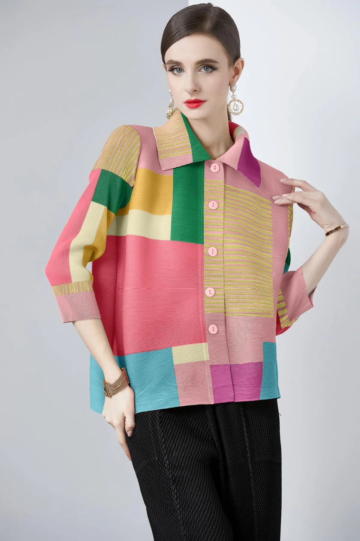 衣都精品- 新款拼色印花氣質時尚休閒皺褶外套