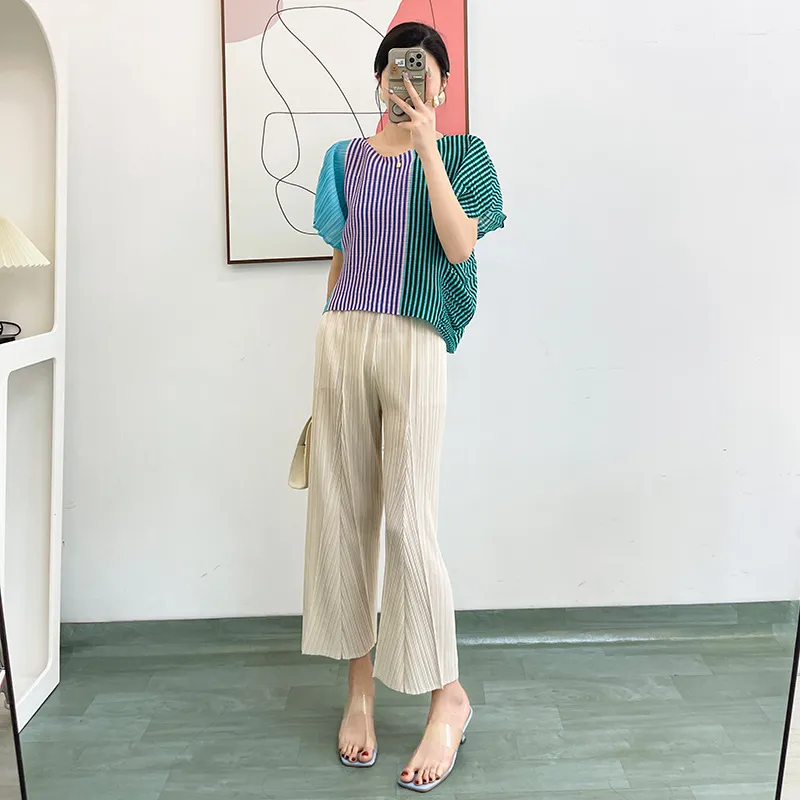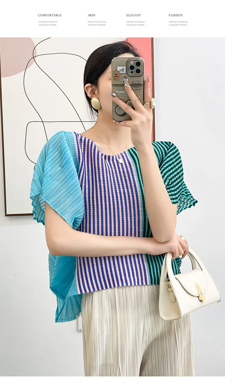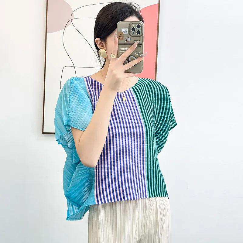 衣都精品- 新款高彈性顯瘦垂感印花短袖大碼褶皺上衣
