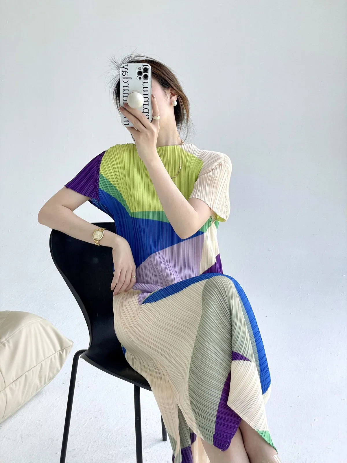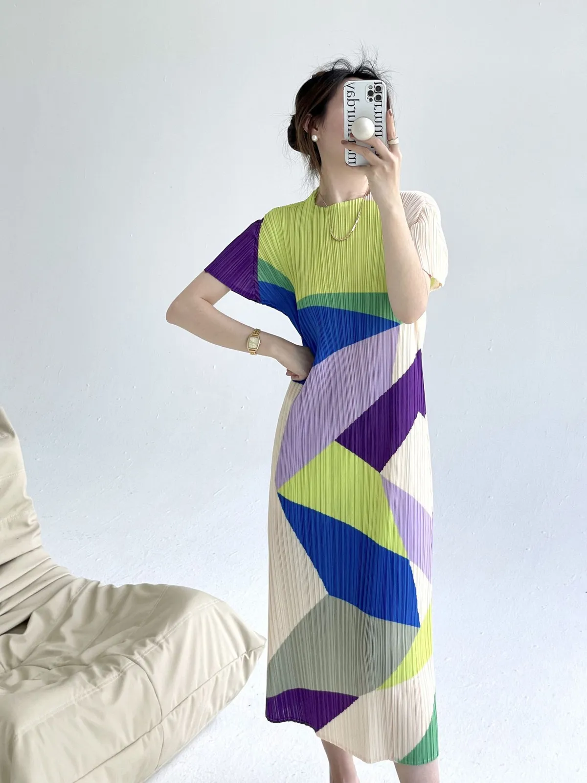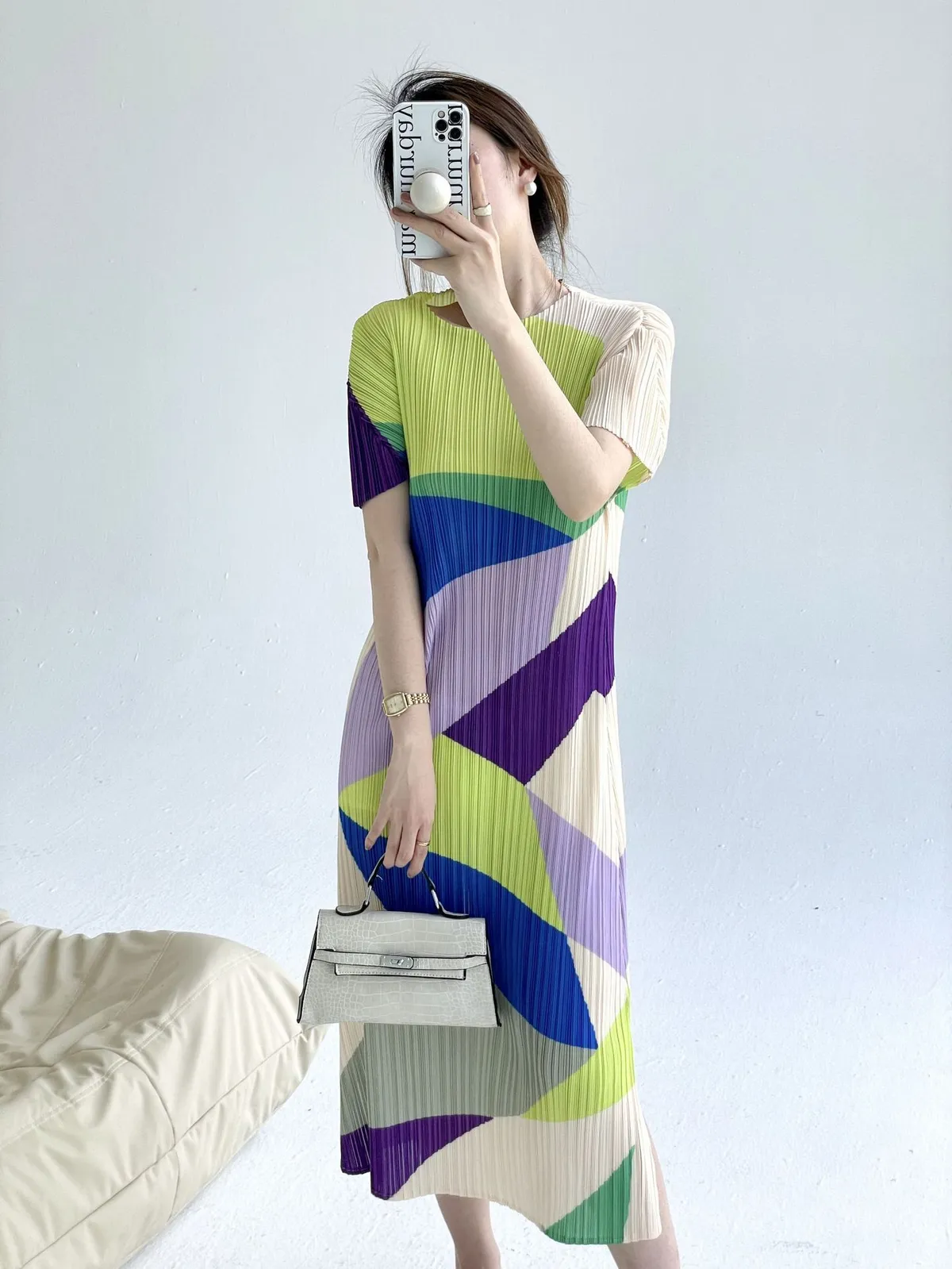 衣都精品- 新款時尚印花氣質修身中長款褶皺連衣裙