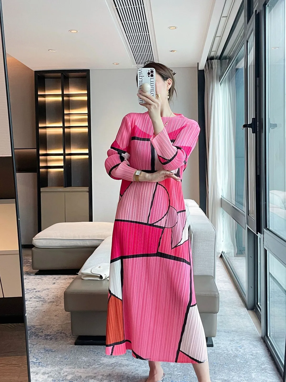 衣都精品- 新款時尚幾何圖案印花顯瘦修身褶皺連衣裙