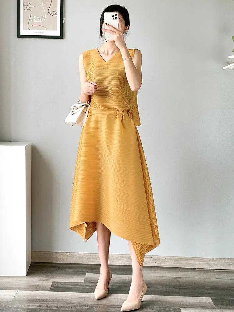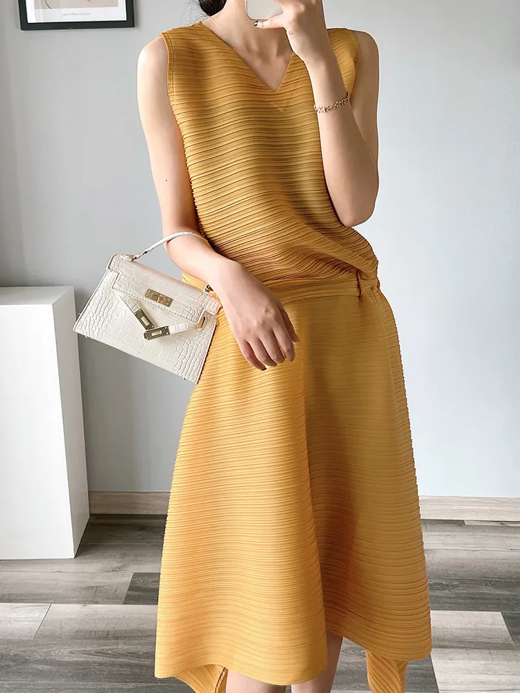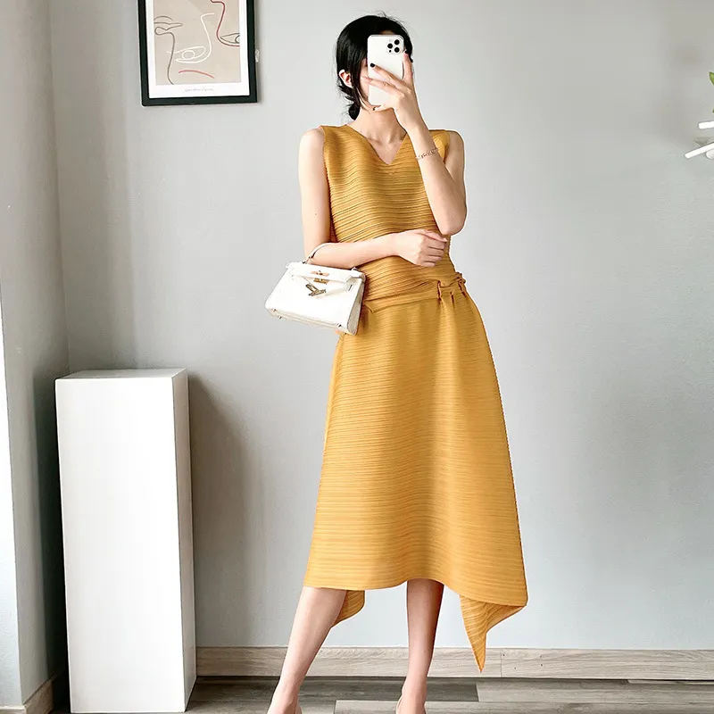 衣都精品- 新款三宅風V領寬鬆氣質無袖褶皺連衣裙