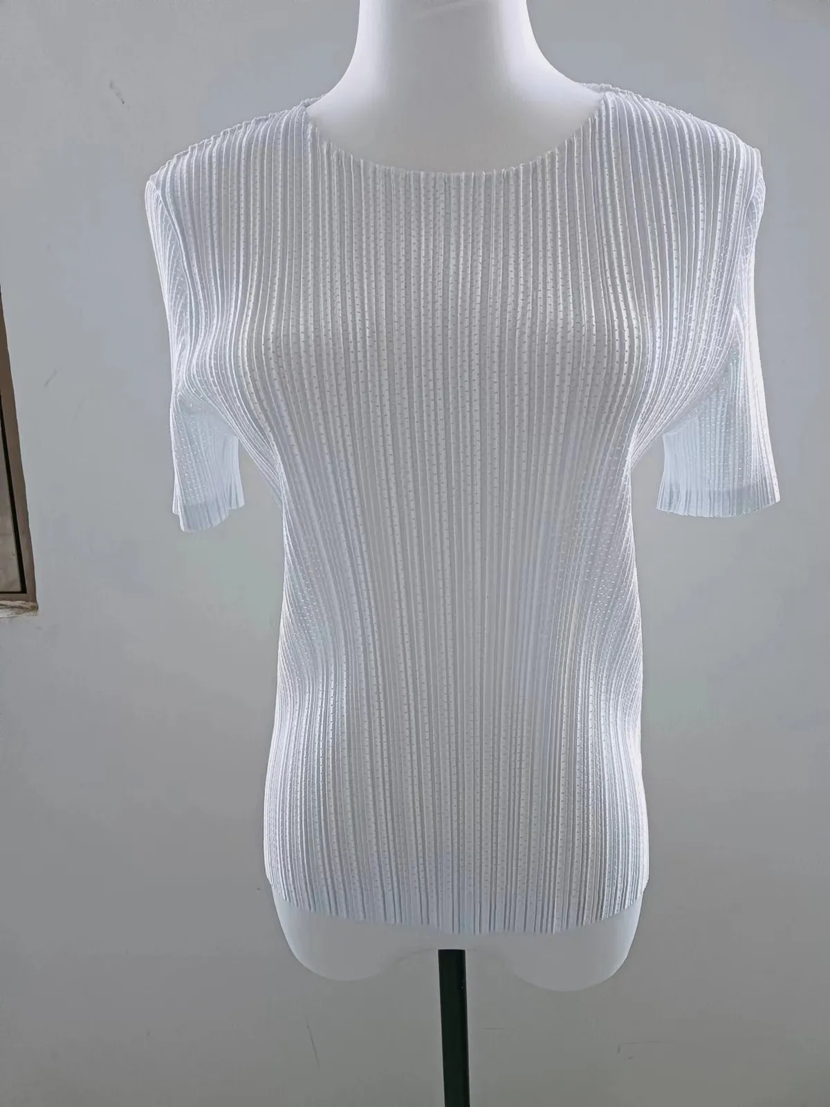 衣都精品- 新款超薄強力彈性透氣圓領修身褶皺上衣