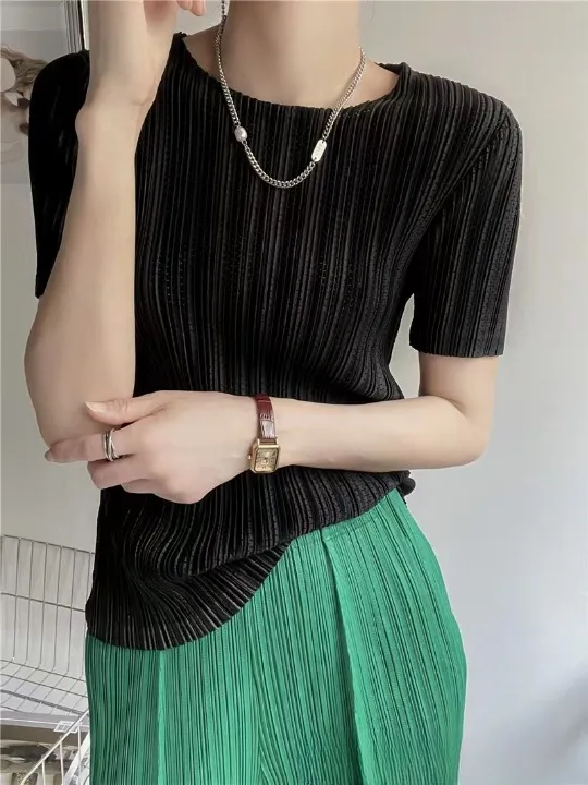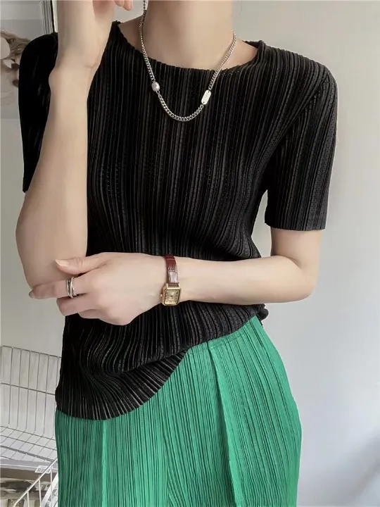 衣都精品- 新款超薄強力彈性透氣圓領修身褶皺上衣