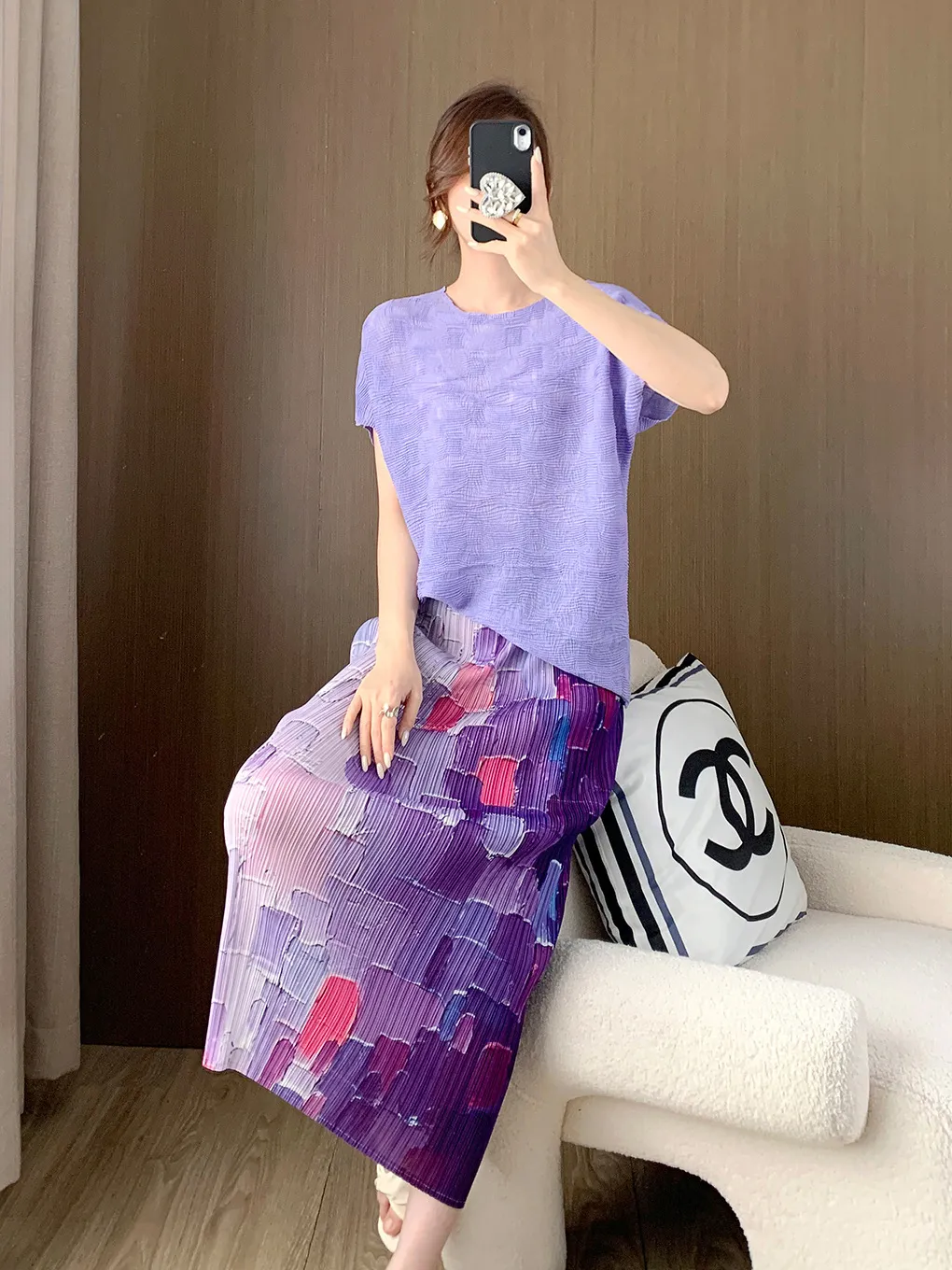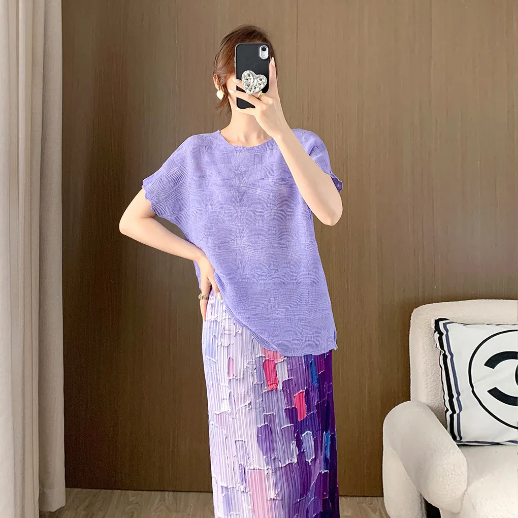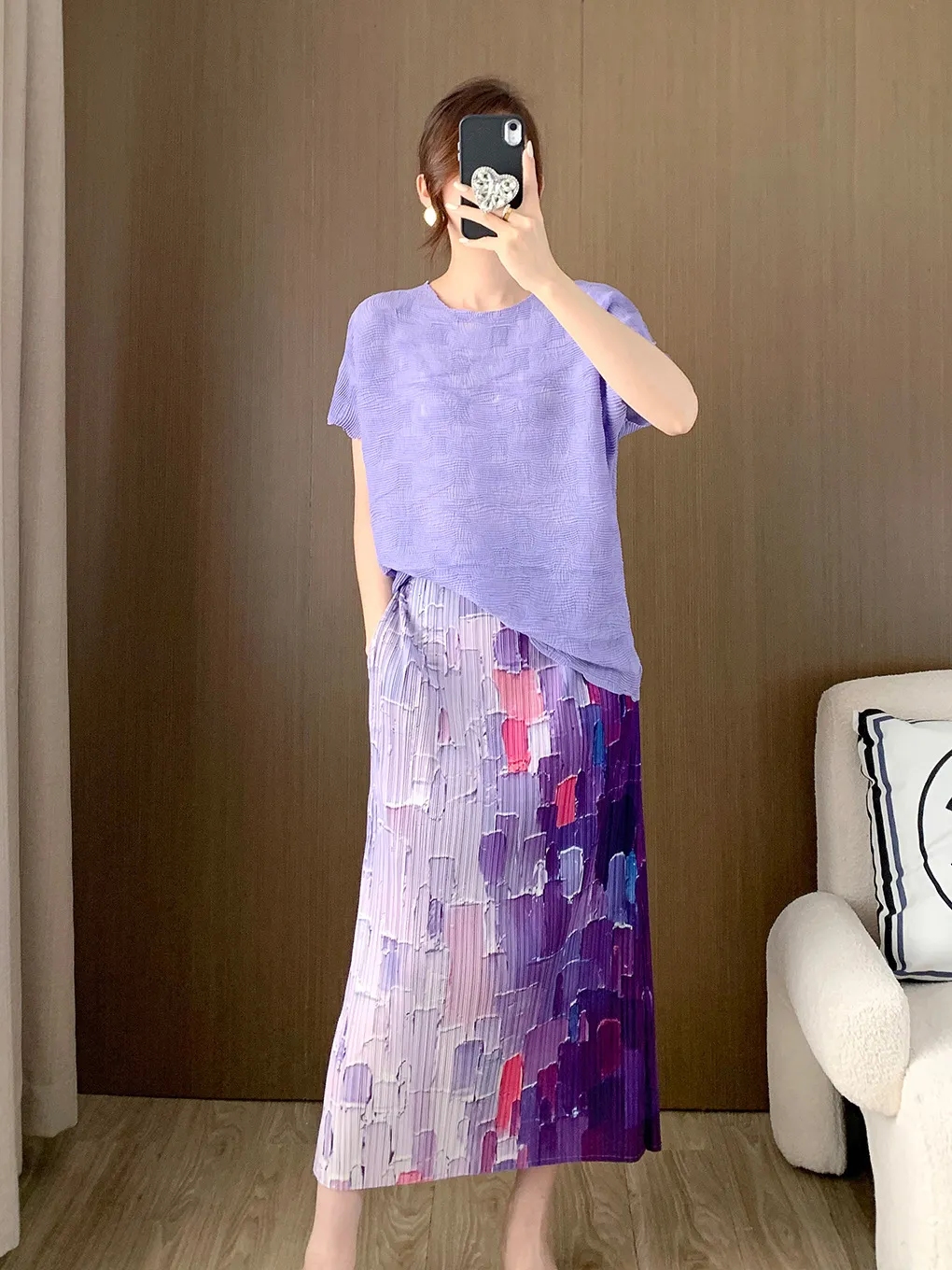 衣都精品- 新款鬆緊腰後開叉包臀漸層褶皺半身裙