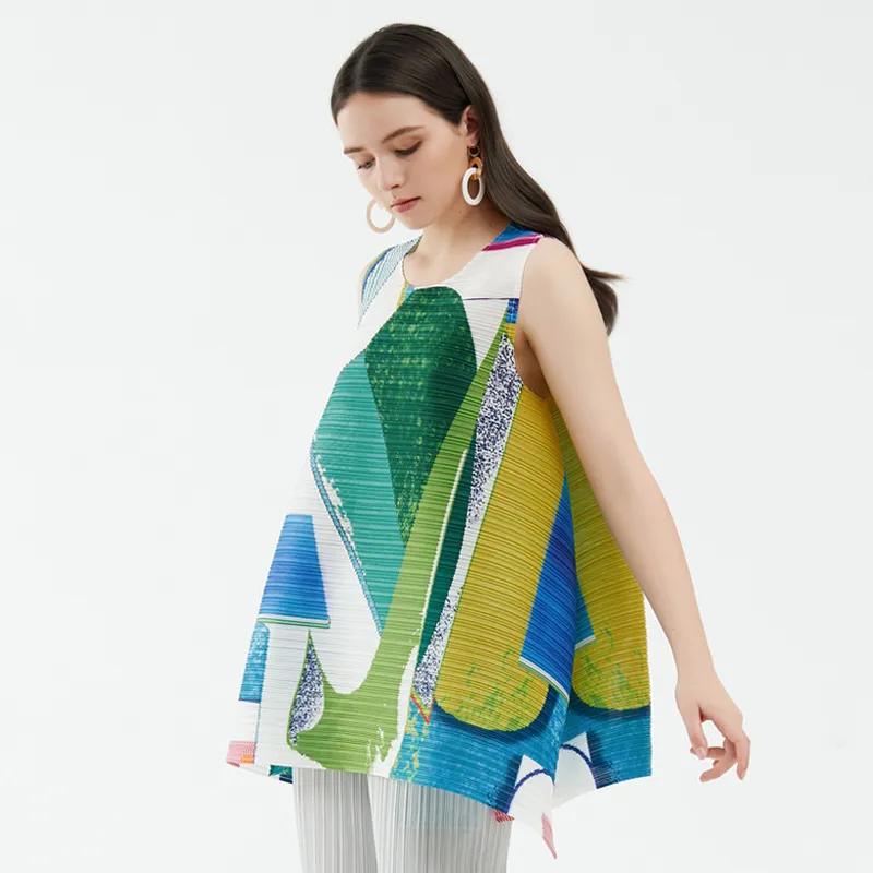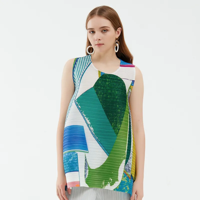 衣都精品- 新款設計感圓領印花背心套頭褶皺上衣
