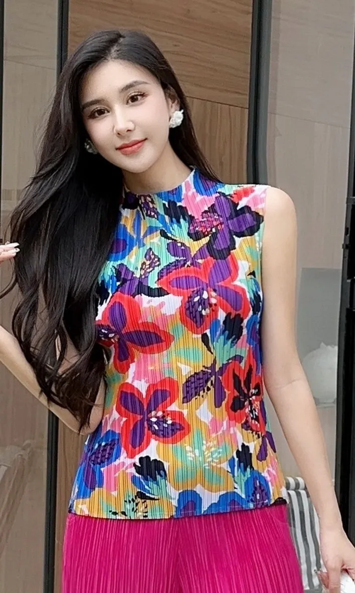 衣都精品- 新款設計感圓領印花背心套頭褶皺上衣