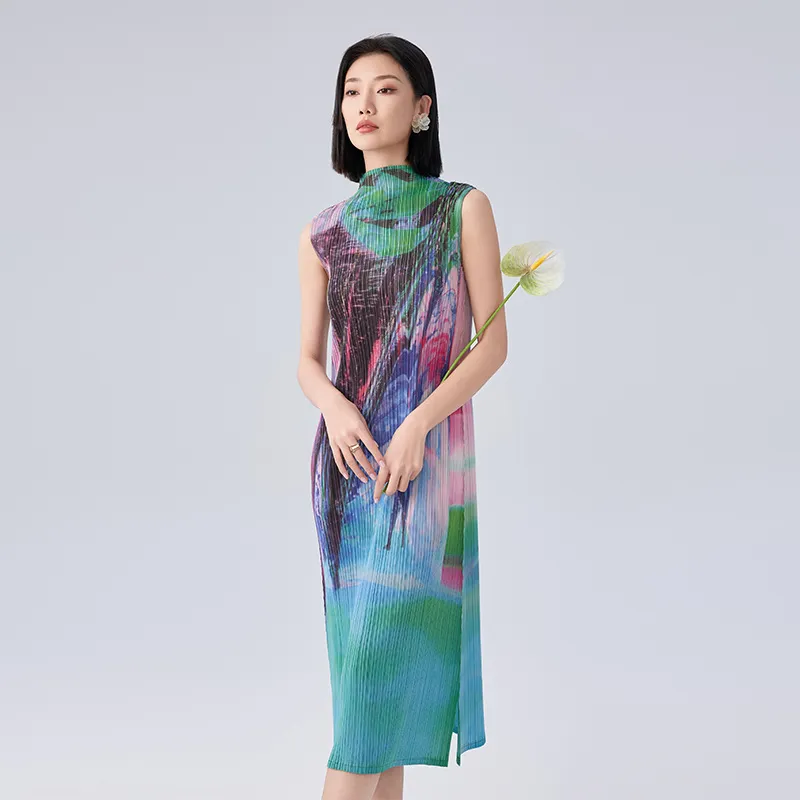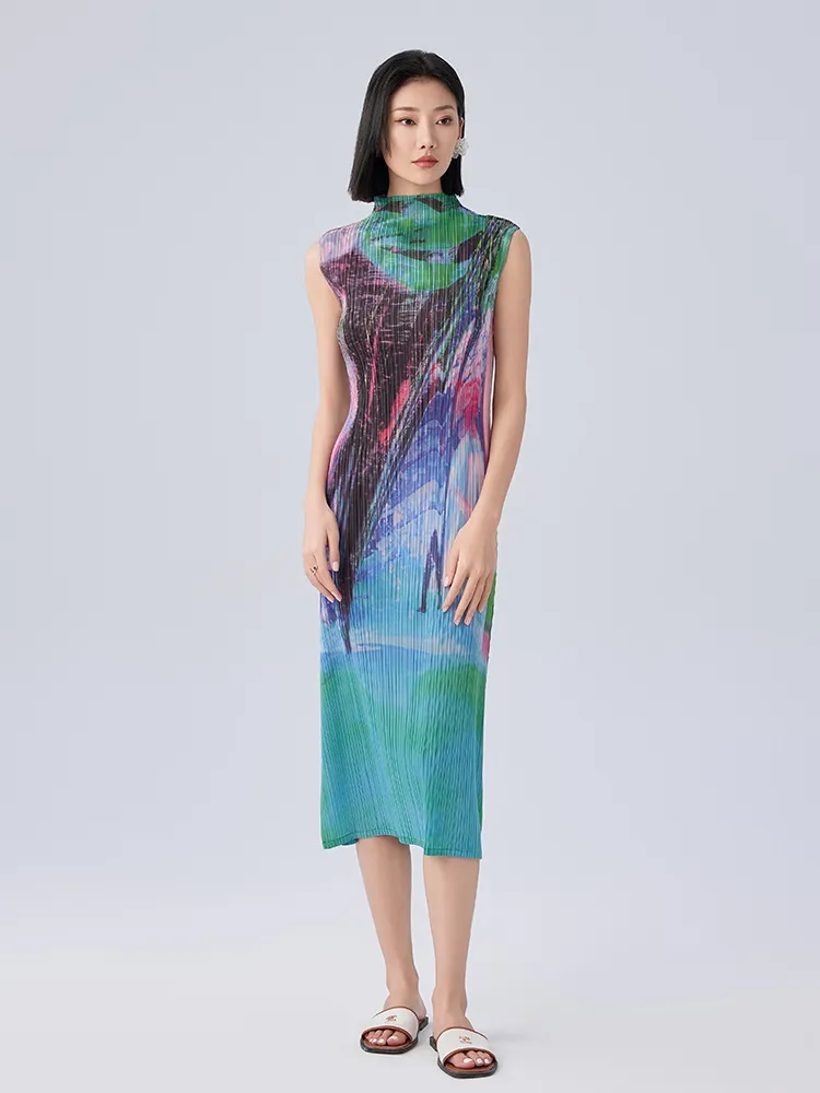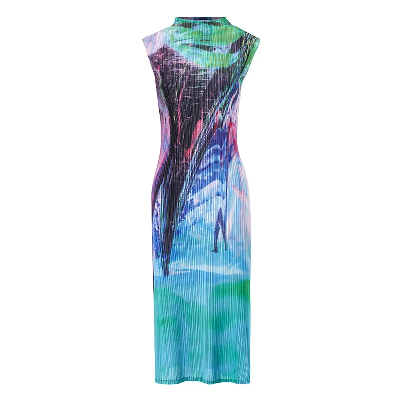 衣都精品- 新款半高領修身顯瘦水墨畫印染褶皺無袖連衣裙