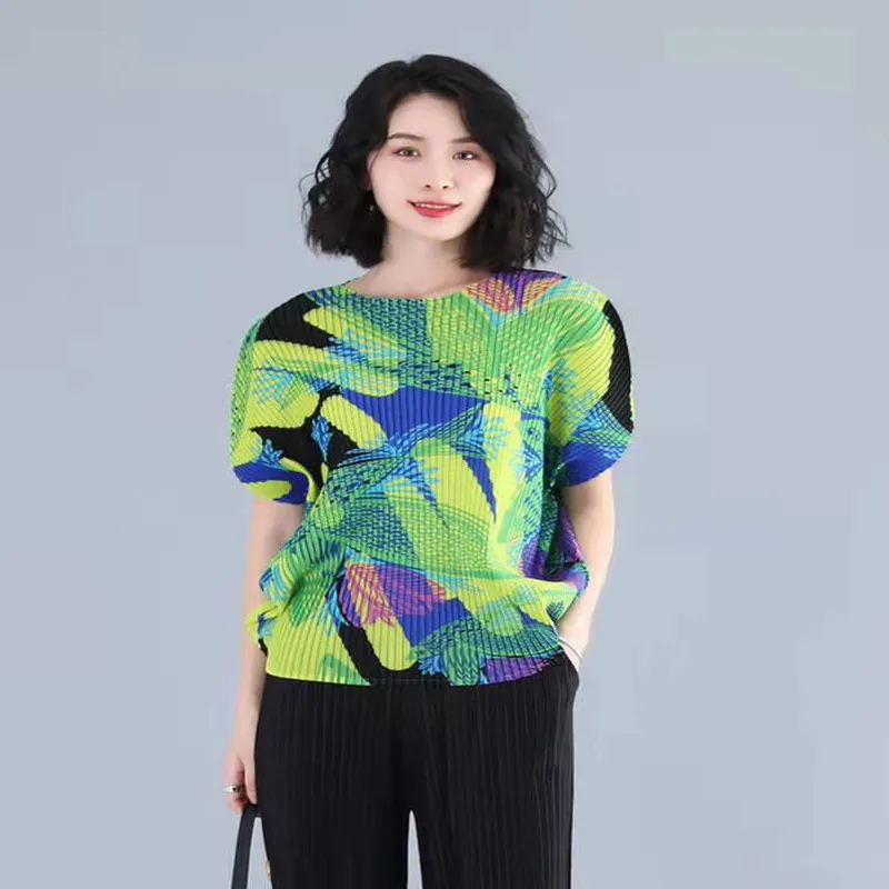 衣都精品- 新款時尚蝙蝠袖圓領套頭印花褶皺上衣