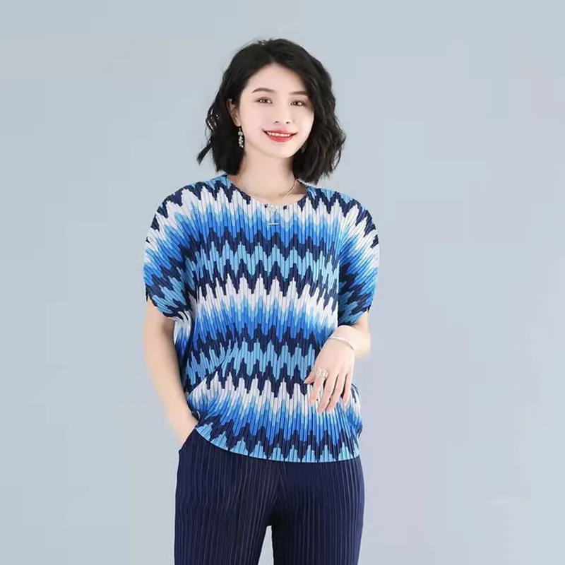 衣都精品- 新款時尚蝙蝠袖圓領套頭印花褶皺上衣