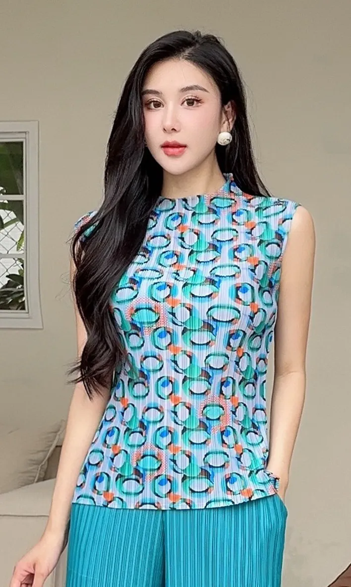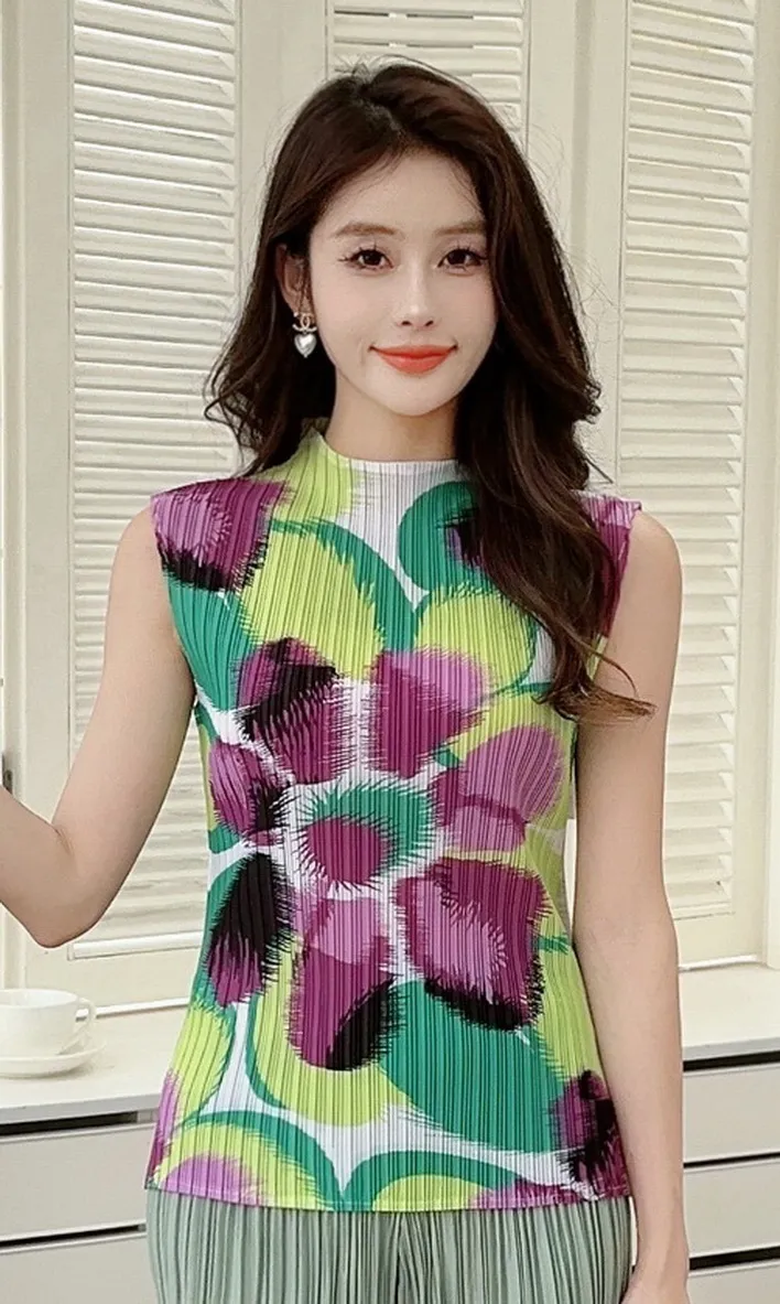 衣都精品- 新款水墨畫印染褶皺無袖上衣+顯瘦直筒褲套裝