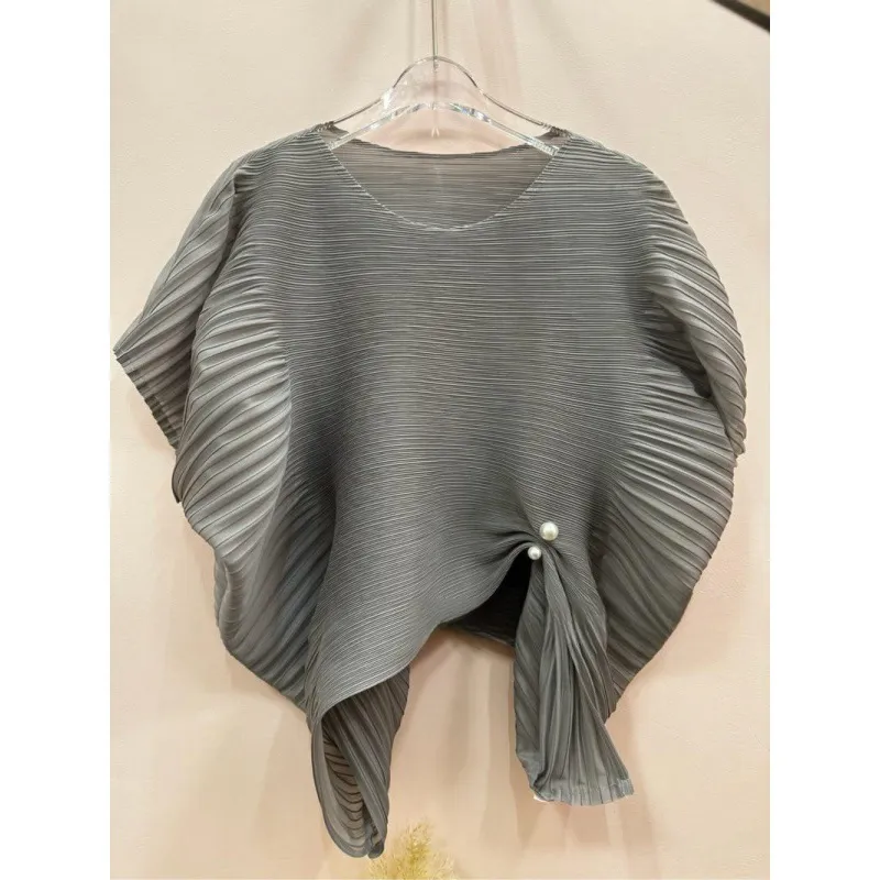 衣都精品- 新款時尚蝙蝠袖圓領套頭印花褶皺上衣