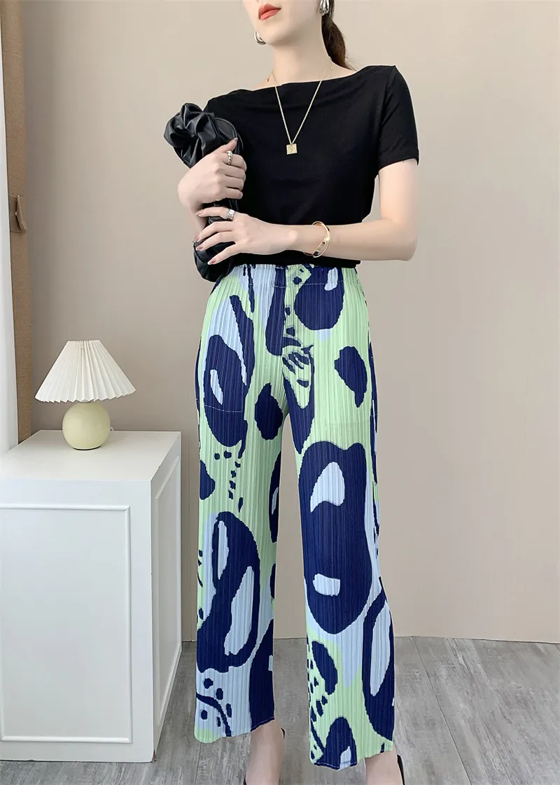 衣都精品- 新款時尚印花氣質優雅上衣+闊腿褲兩件式褶皺套裝