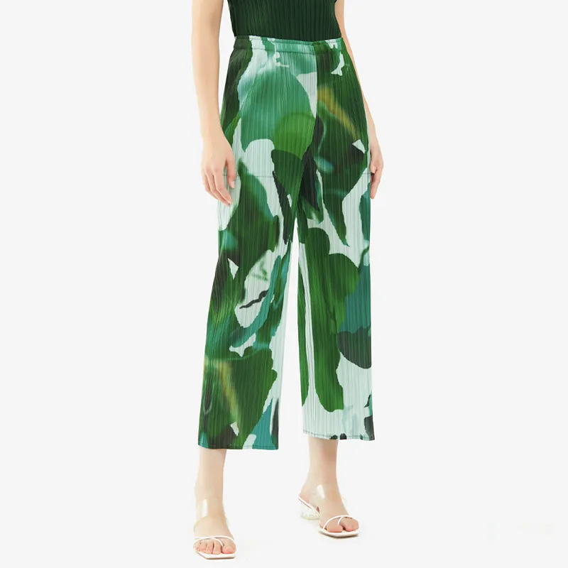 衣都精品- 新款獨家設計感印花直筒九分褶皺闊腿褲