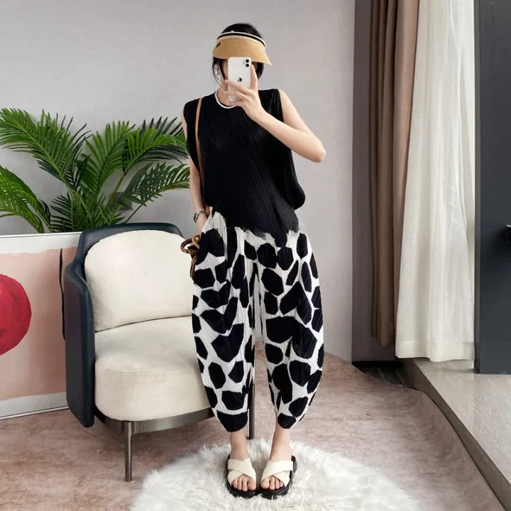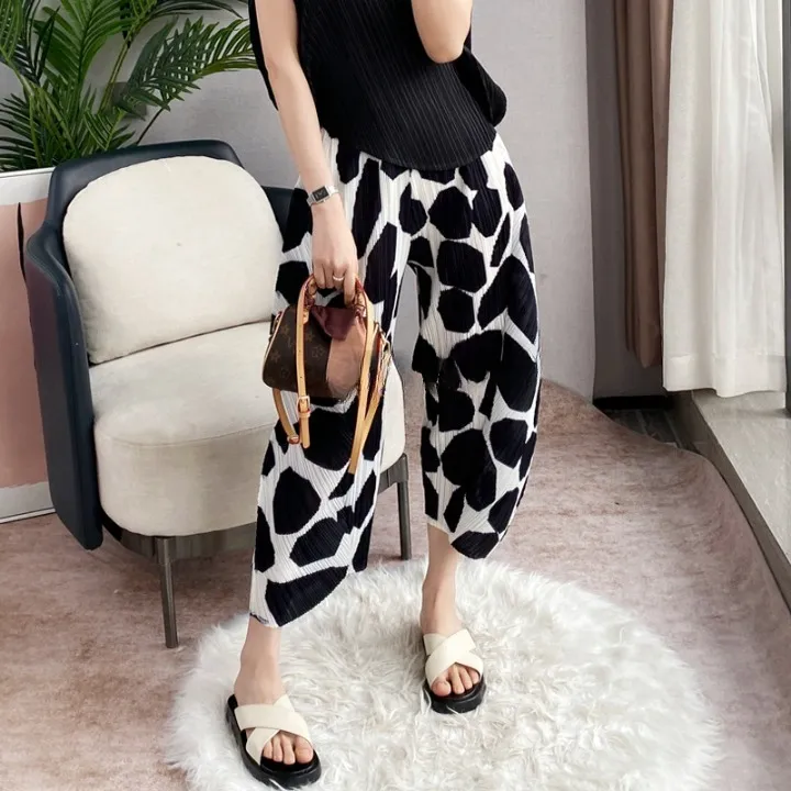 衣都精品- 新款時尚休閒黑白印花薄款褶皺哈倫褲